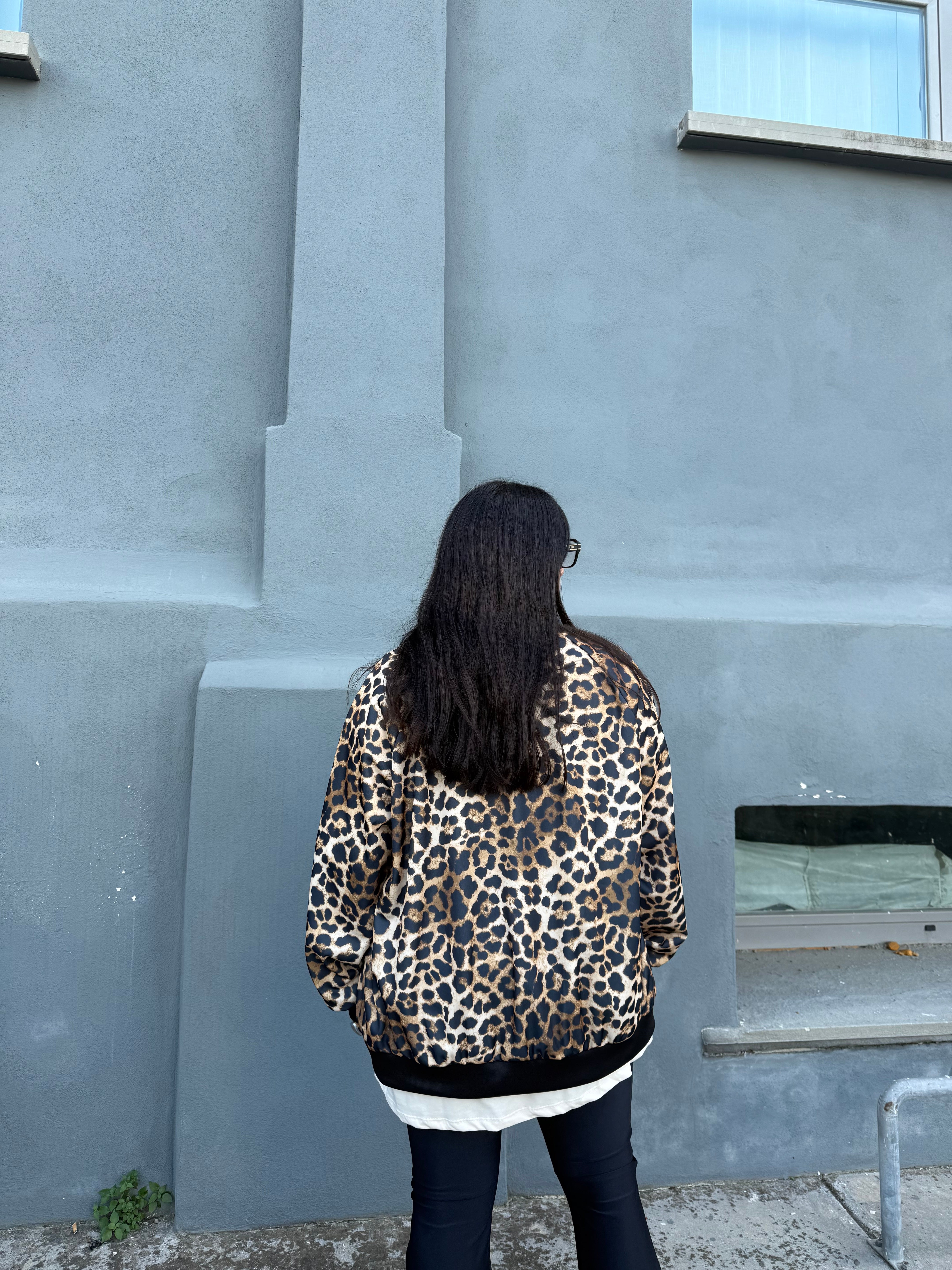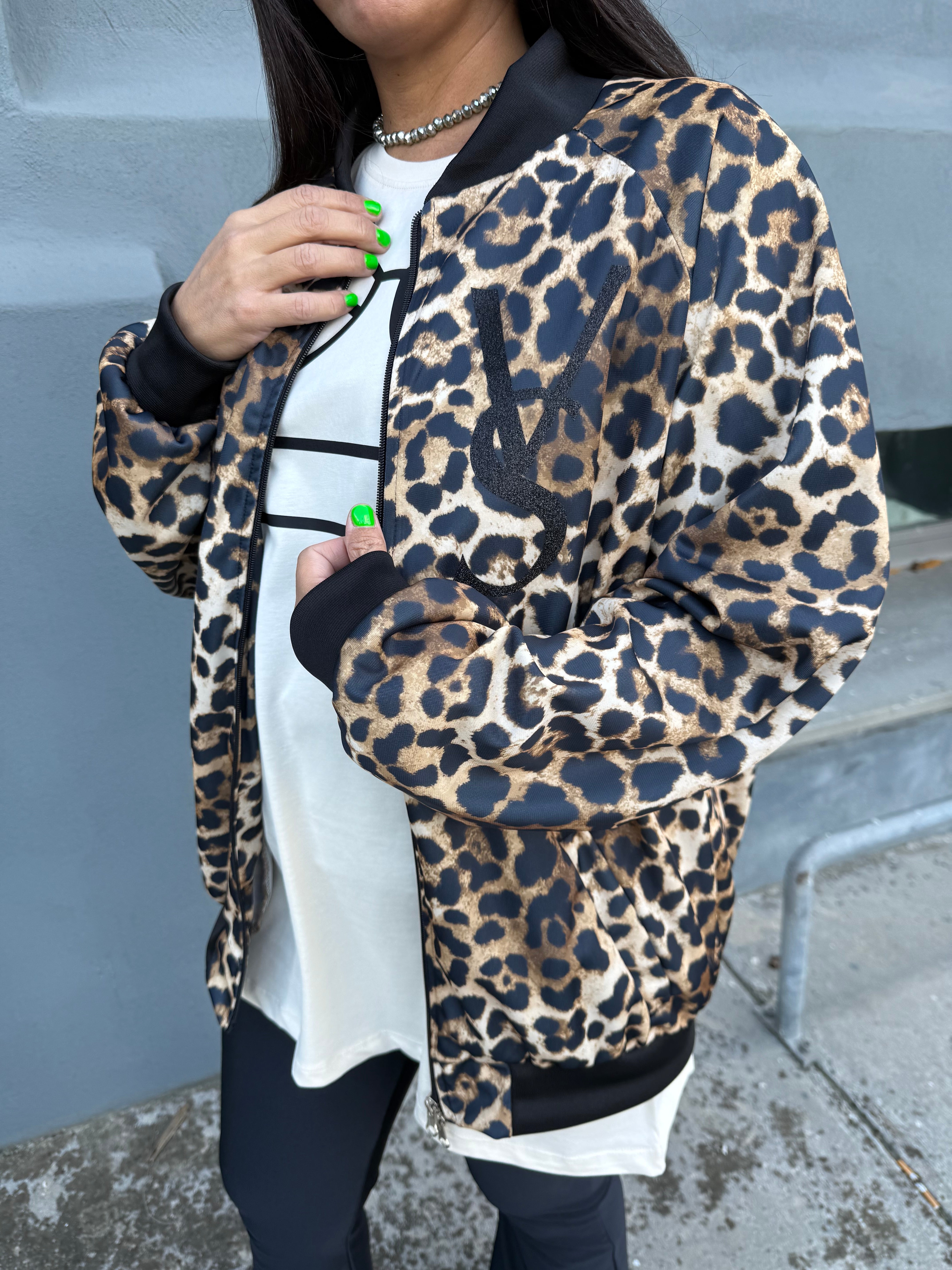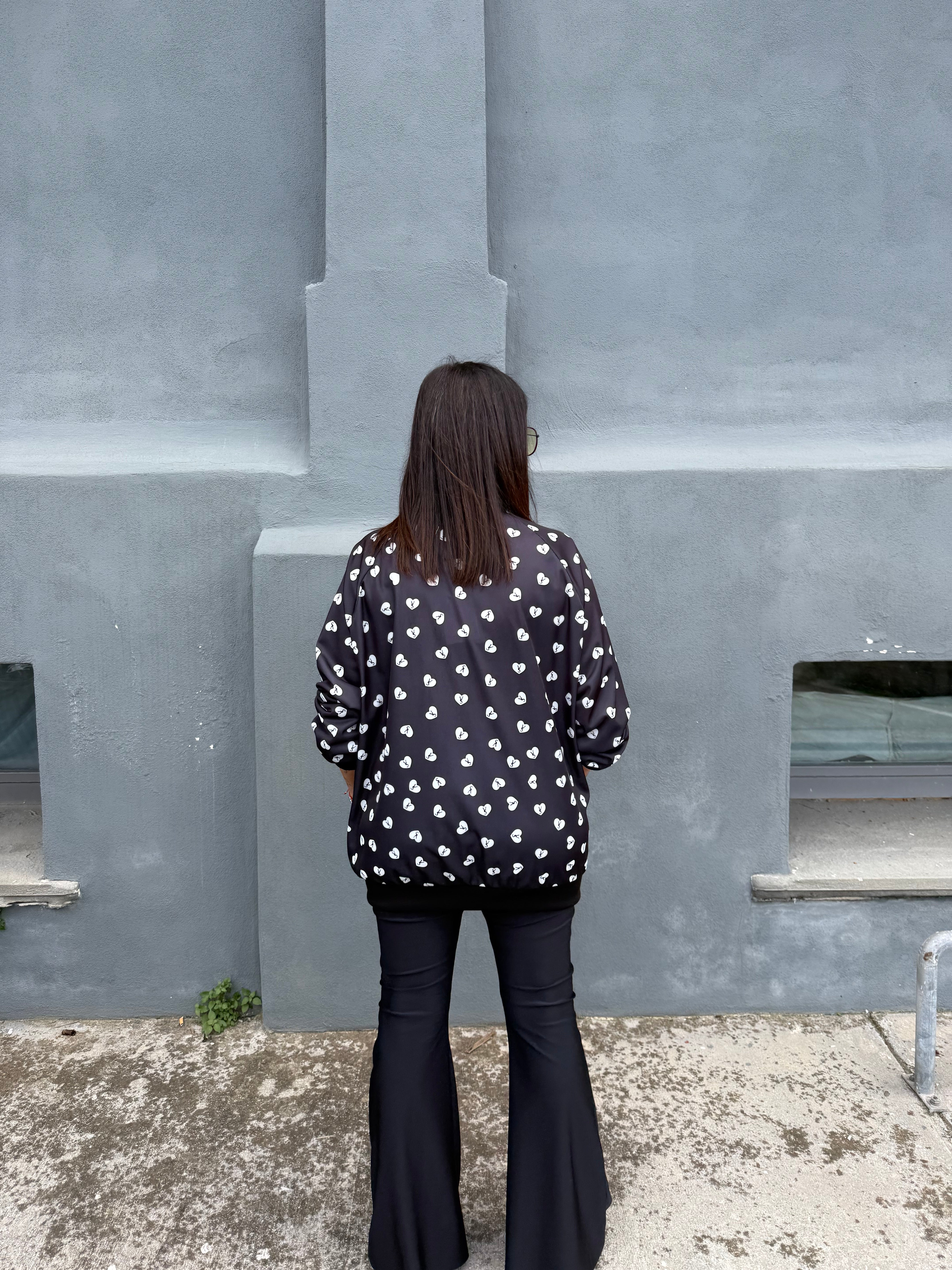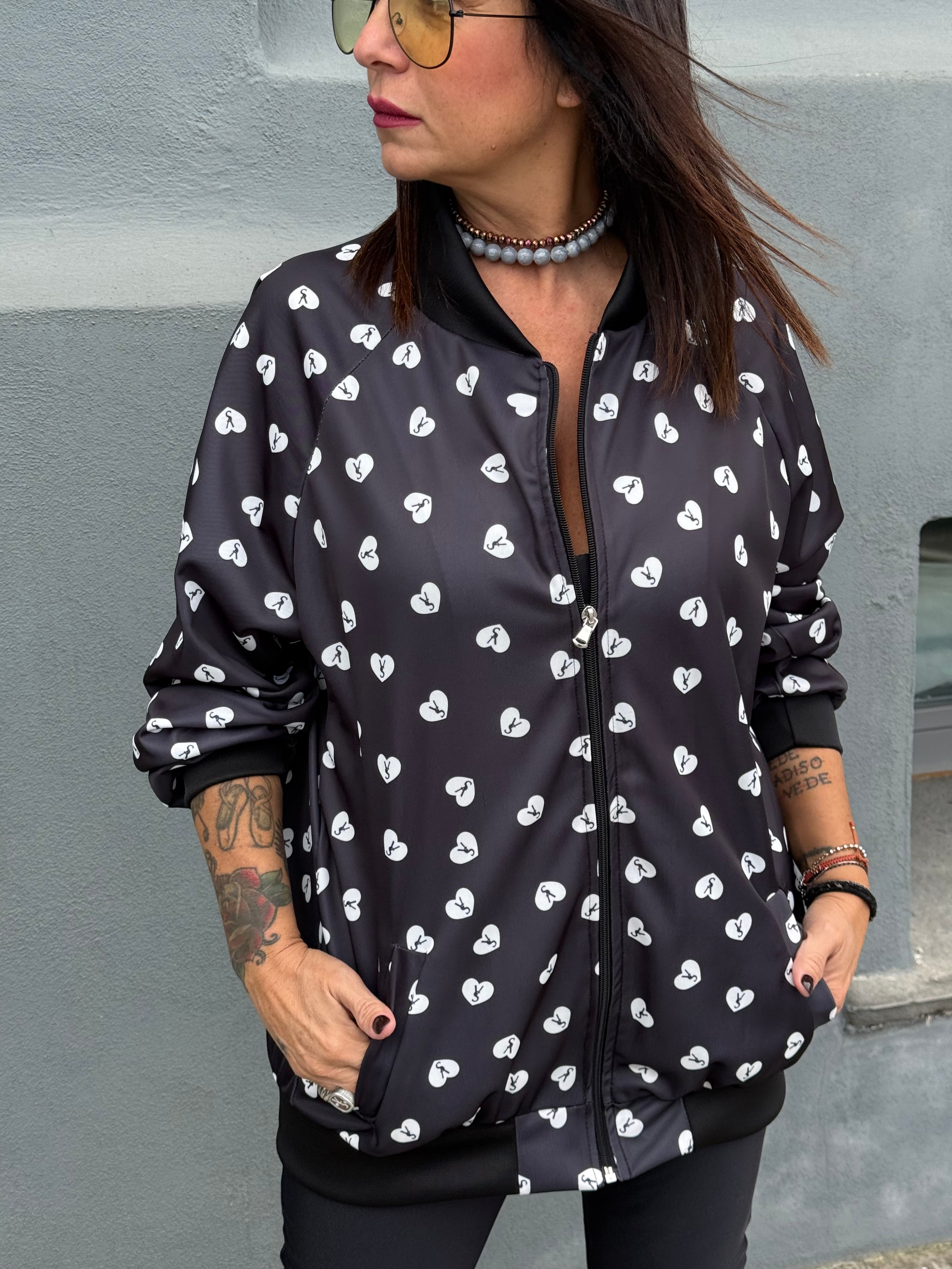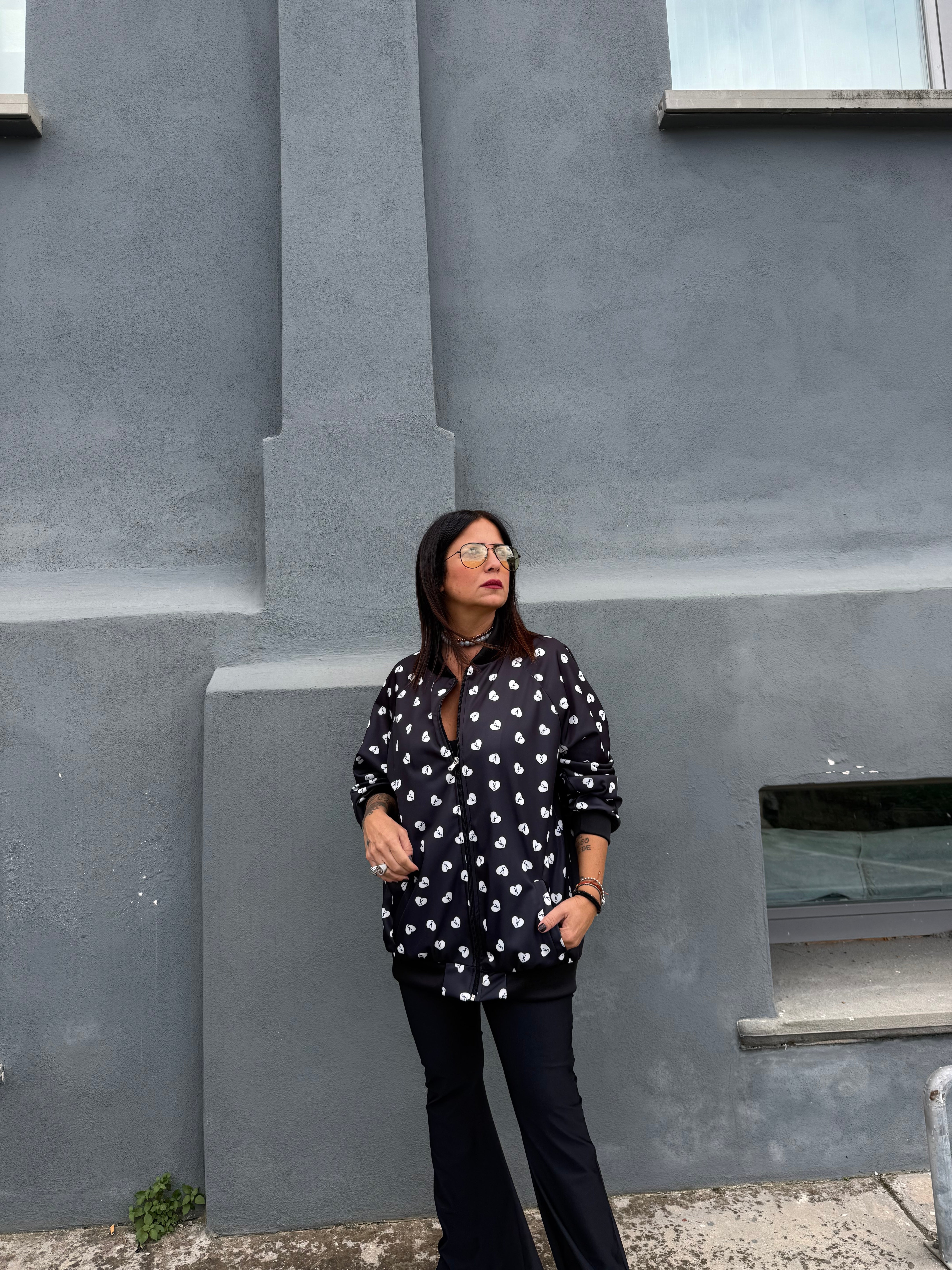 Bomber in tessuto acetato con fantasia cuoricini animalier e zebrata, arricchito da una stampa frontale glitter del logo.