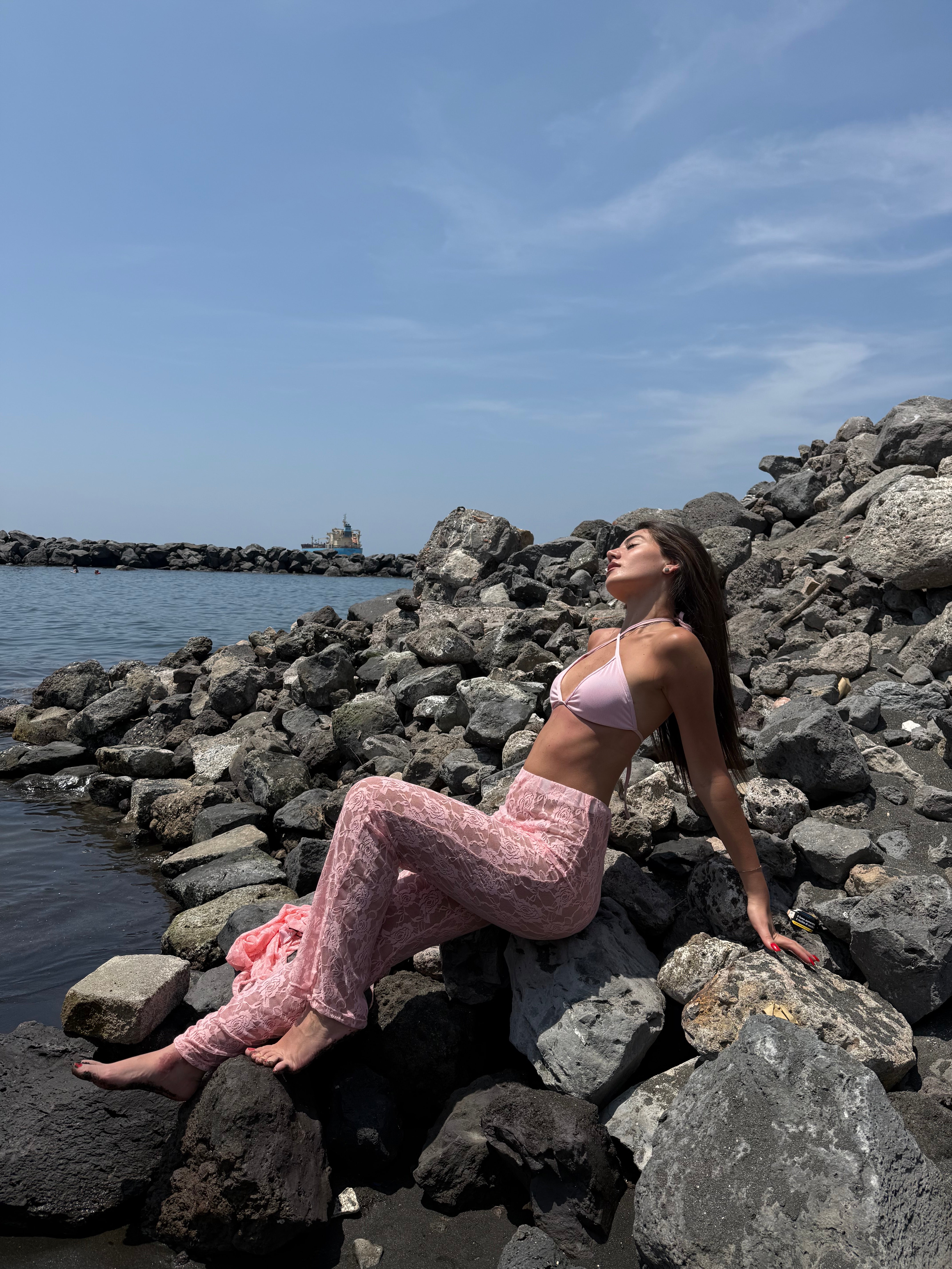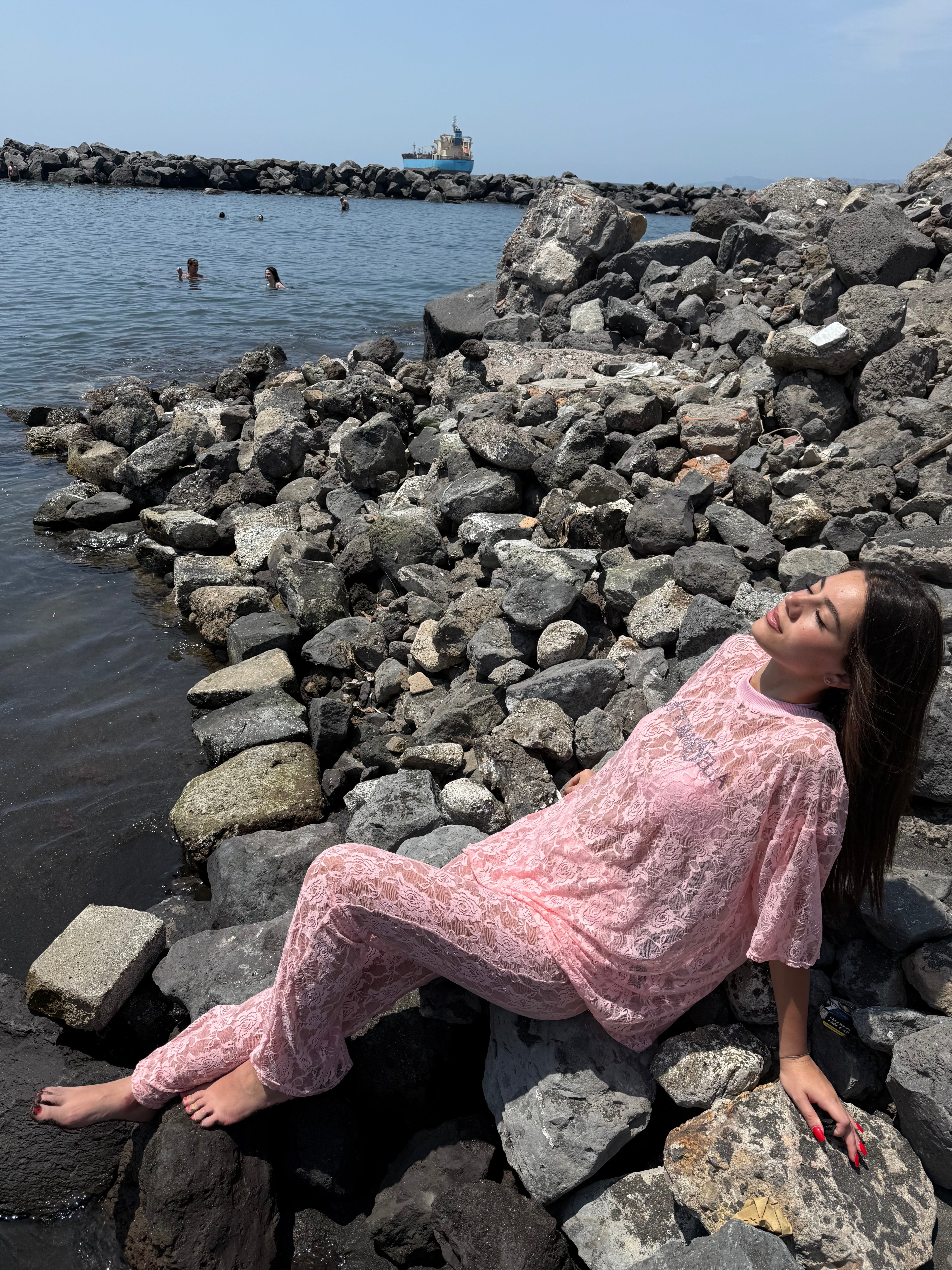Coordinato composto da t-shirt over e pantalone trasparente in pizzo oppure abbinato a una gonna lunga con sottogonna integrata.