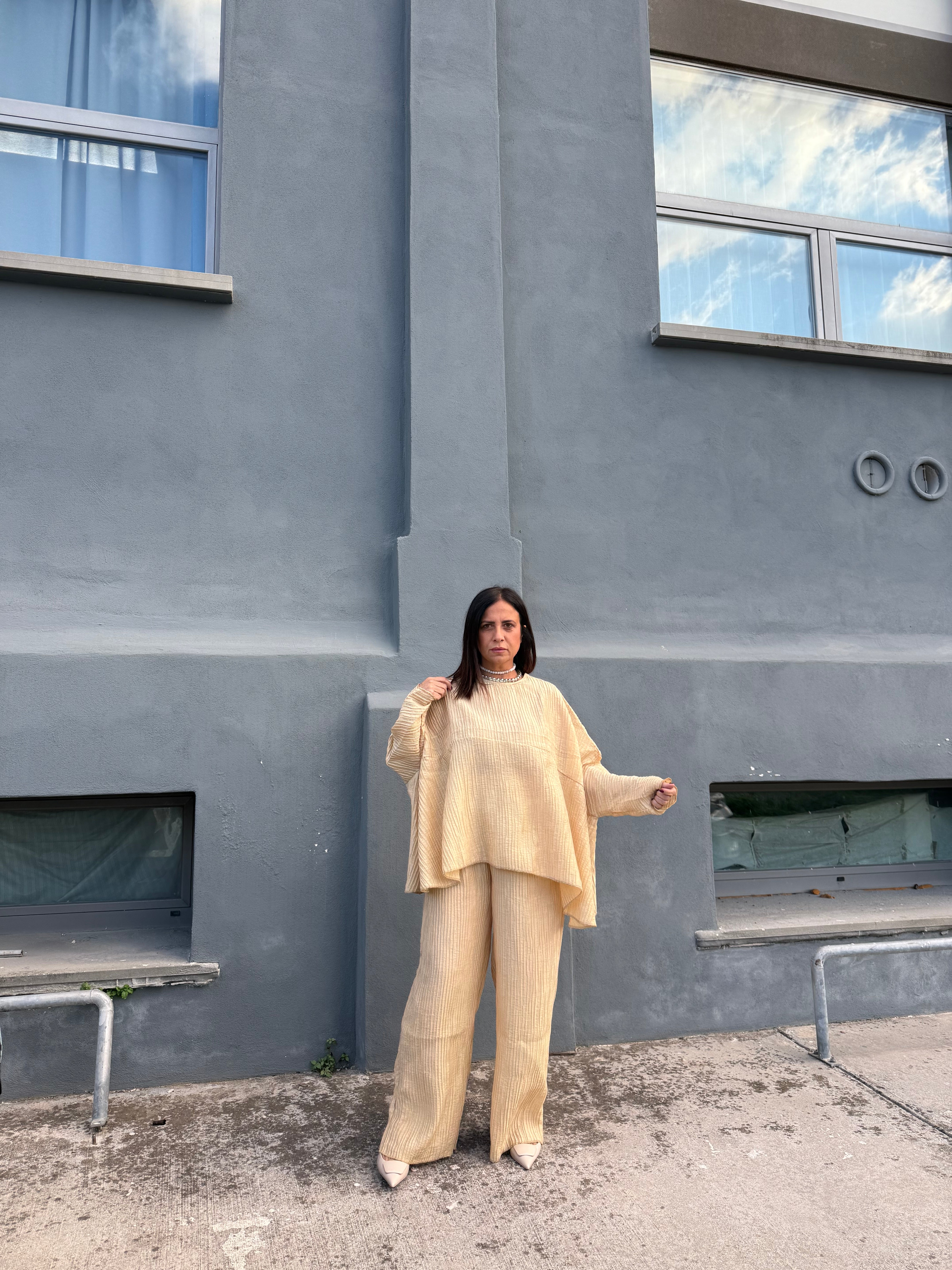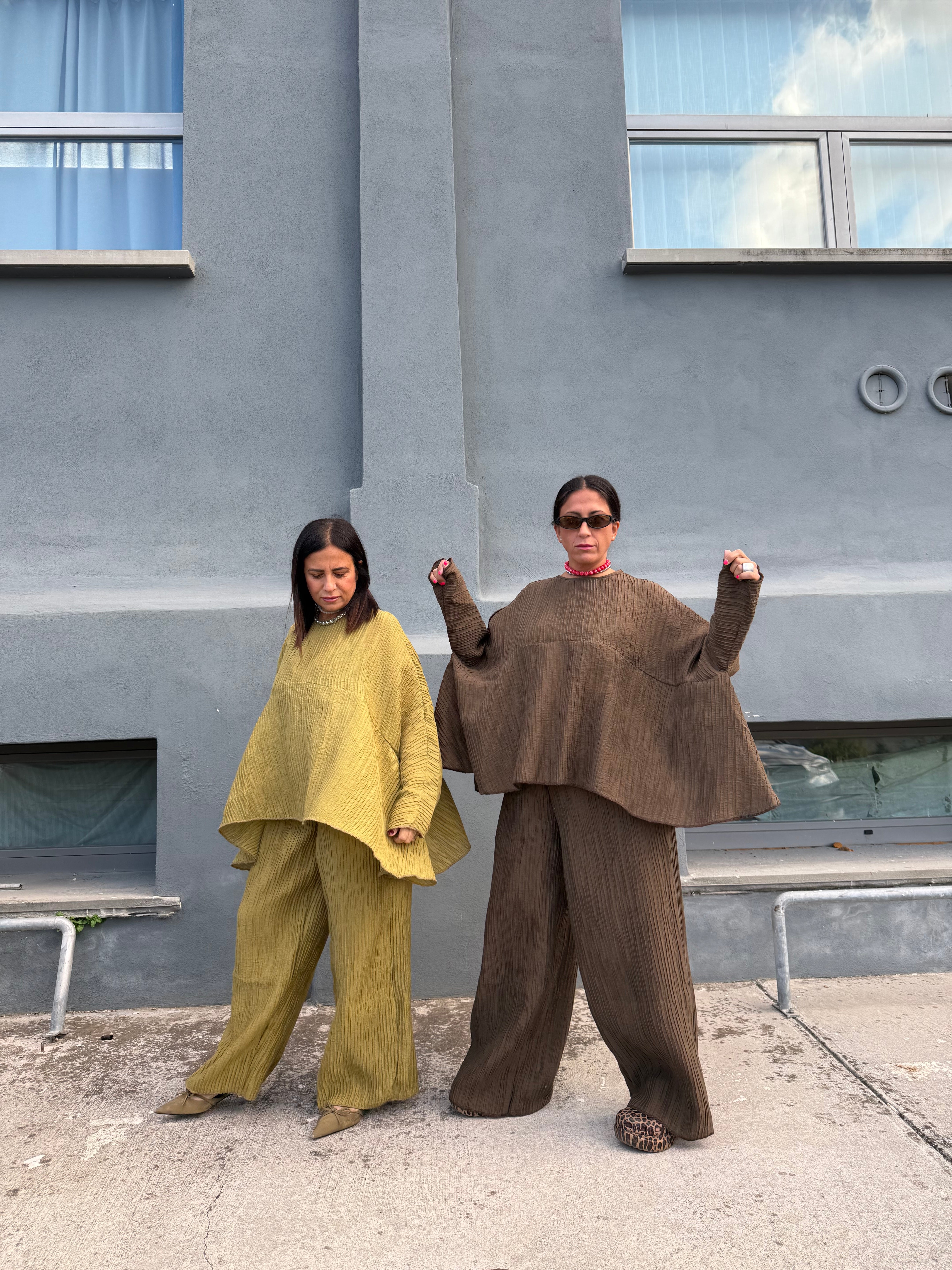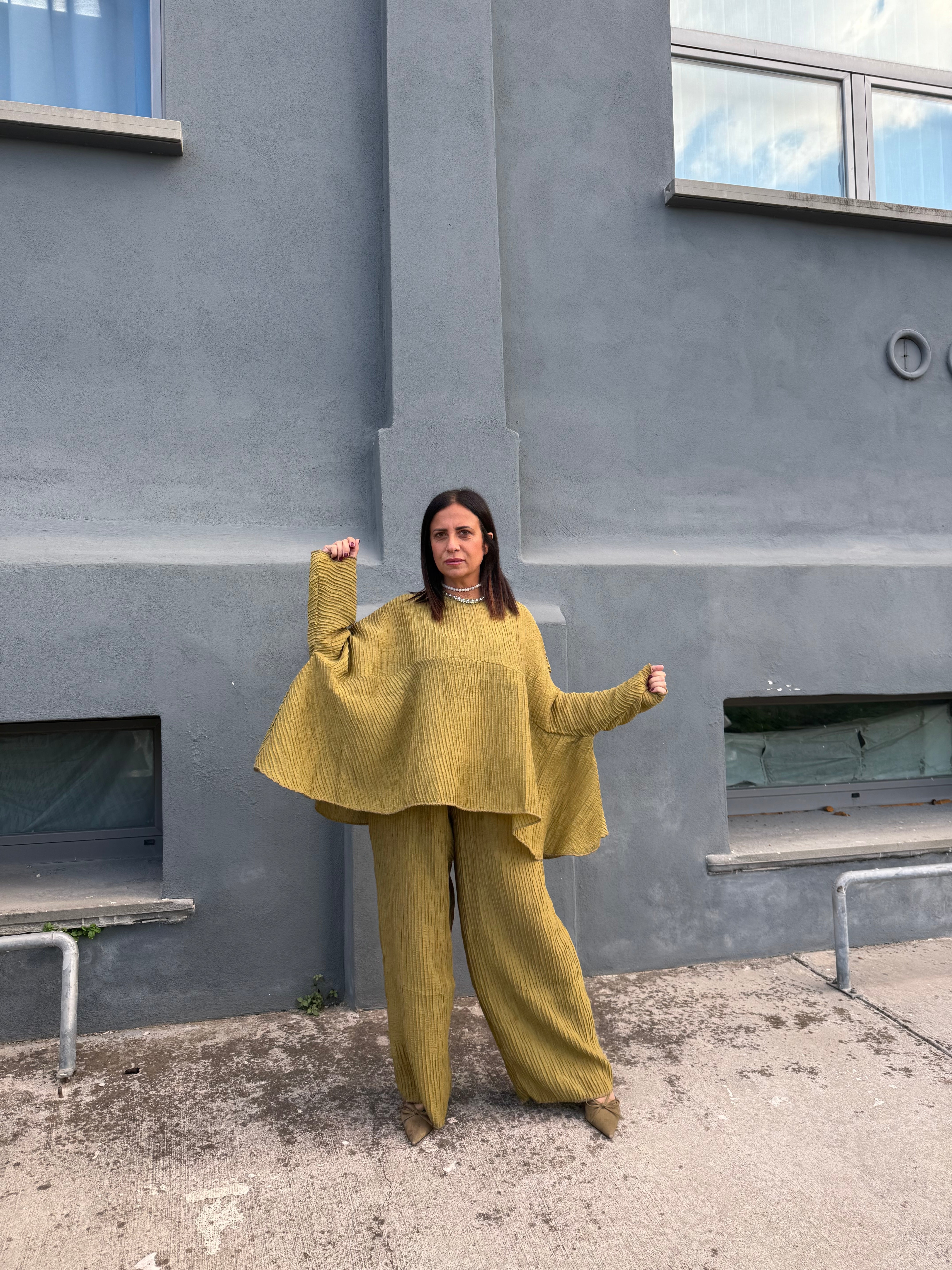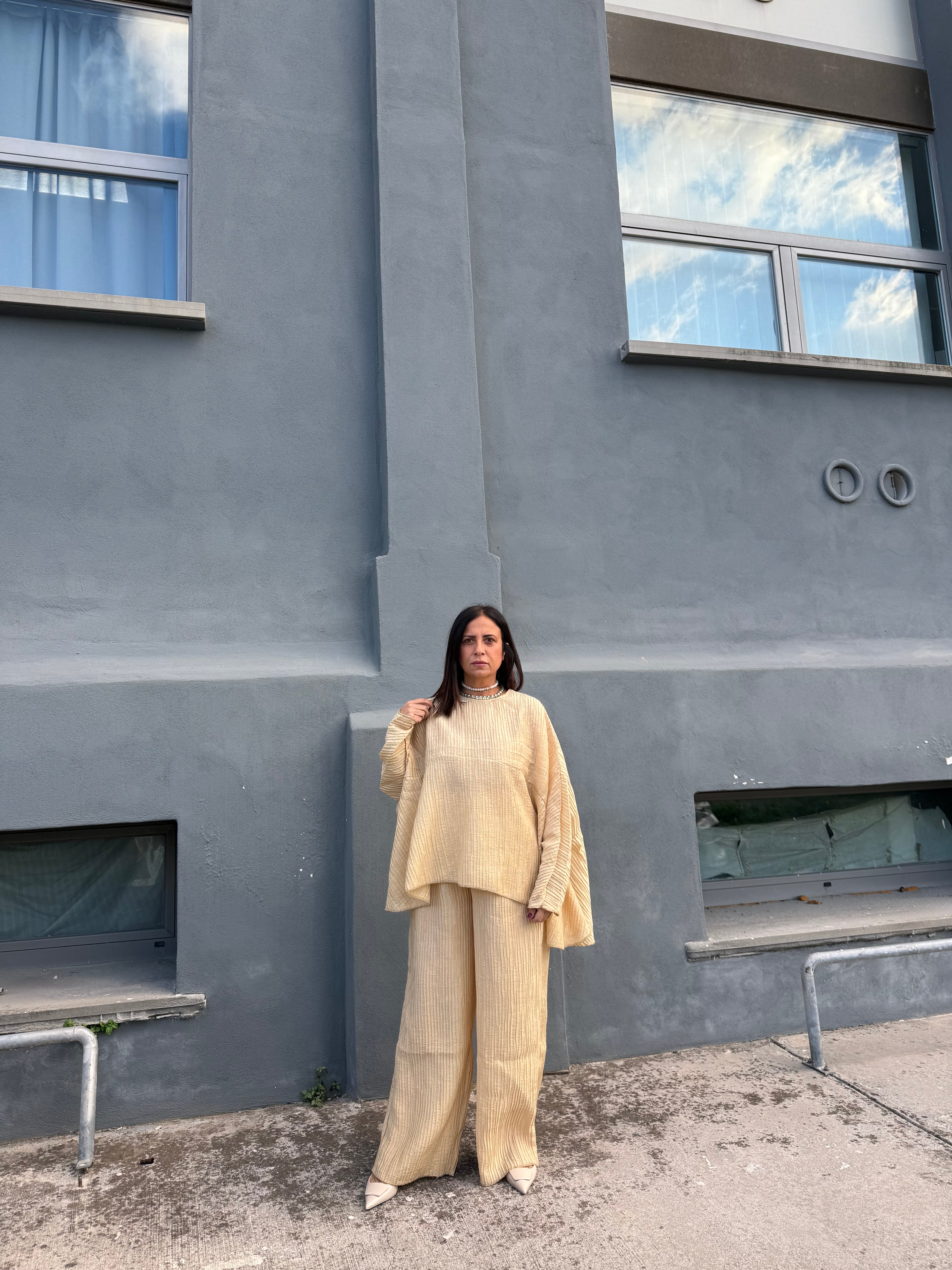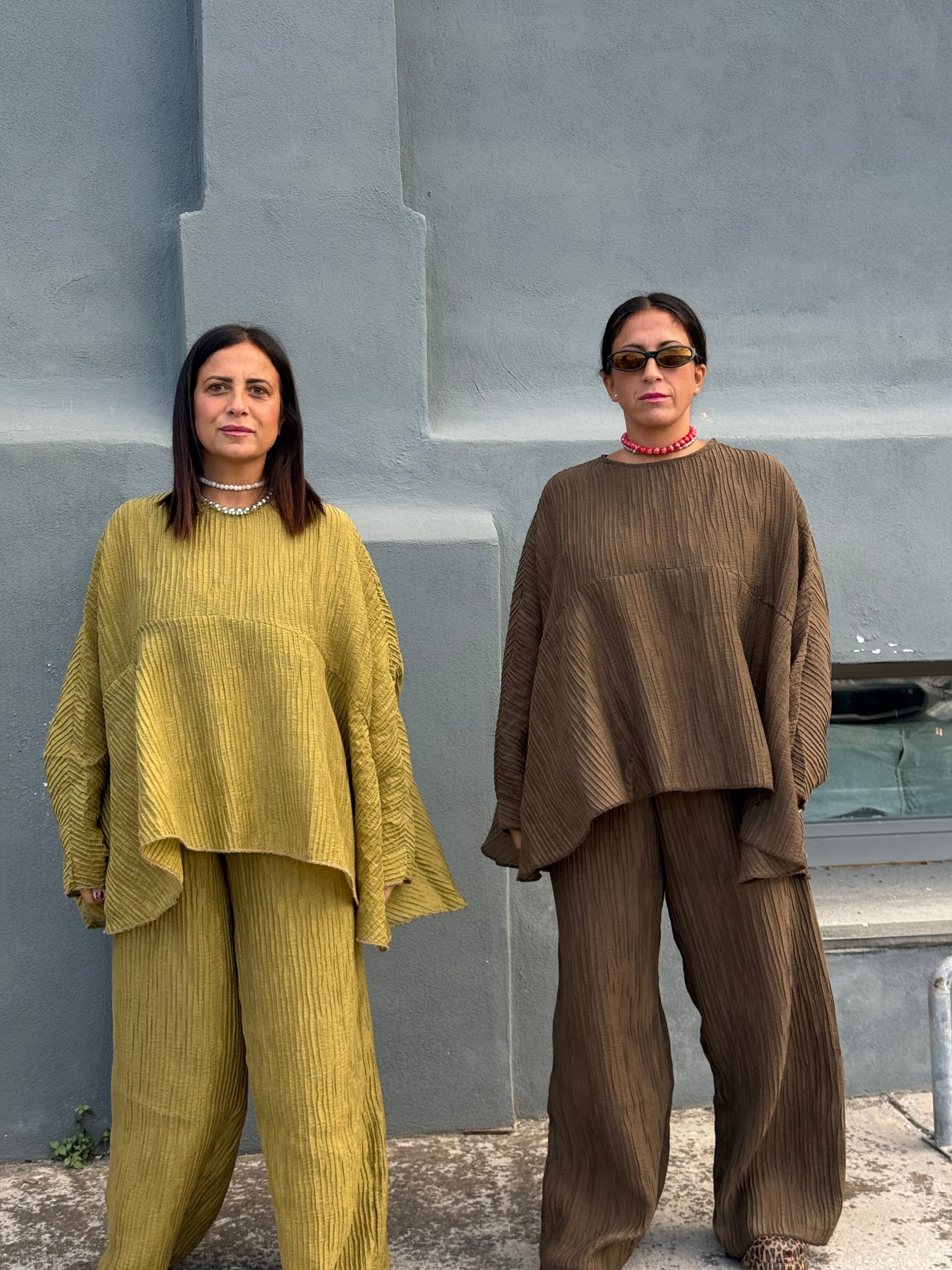 Coordinato in,Lyocell conosciuto anche con il marchio Tencel, è una fibra tessile artificiale ricavata dalla cellulosa di alberi come l'eucalipto, prodotta tramite un processo ecologico a basso impatto ambientale e a ciclo chiuso che permette di riciclare i solventi. Questo tessuto è apprezzato per la sua morbidezza simile alla seta,