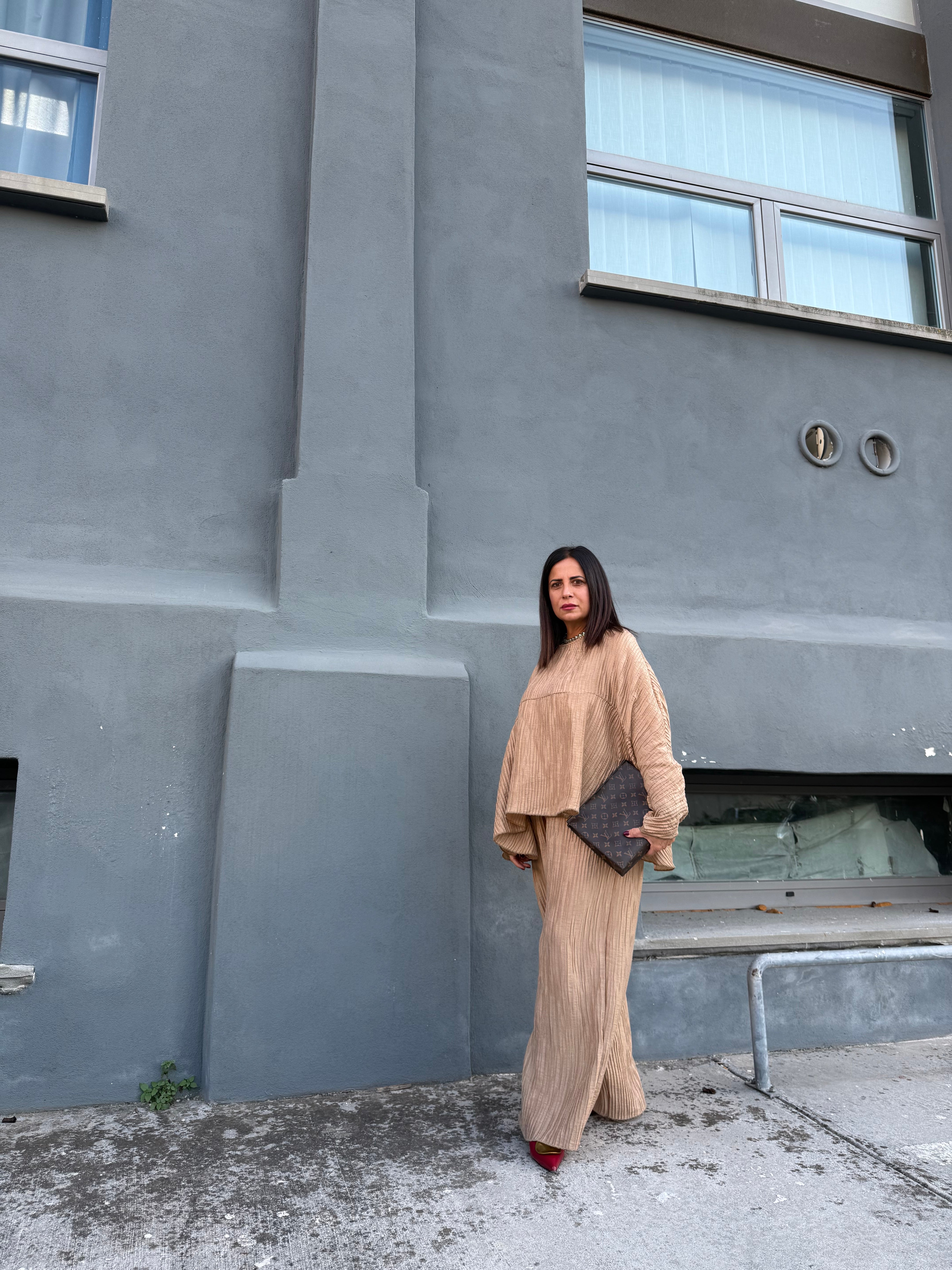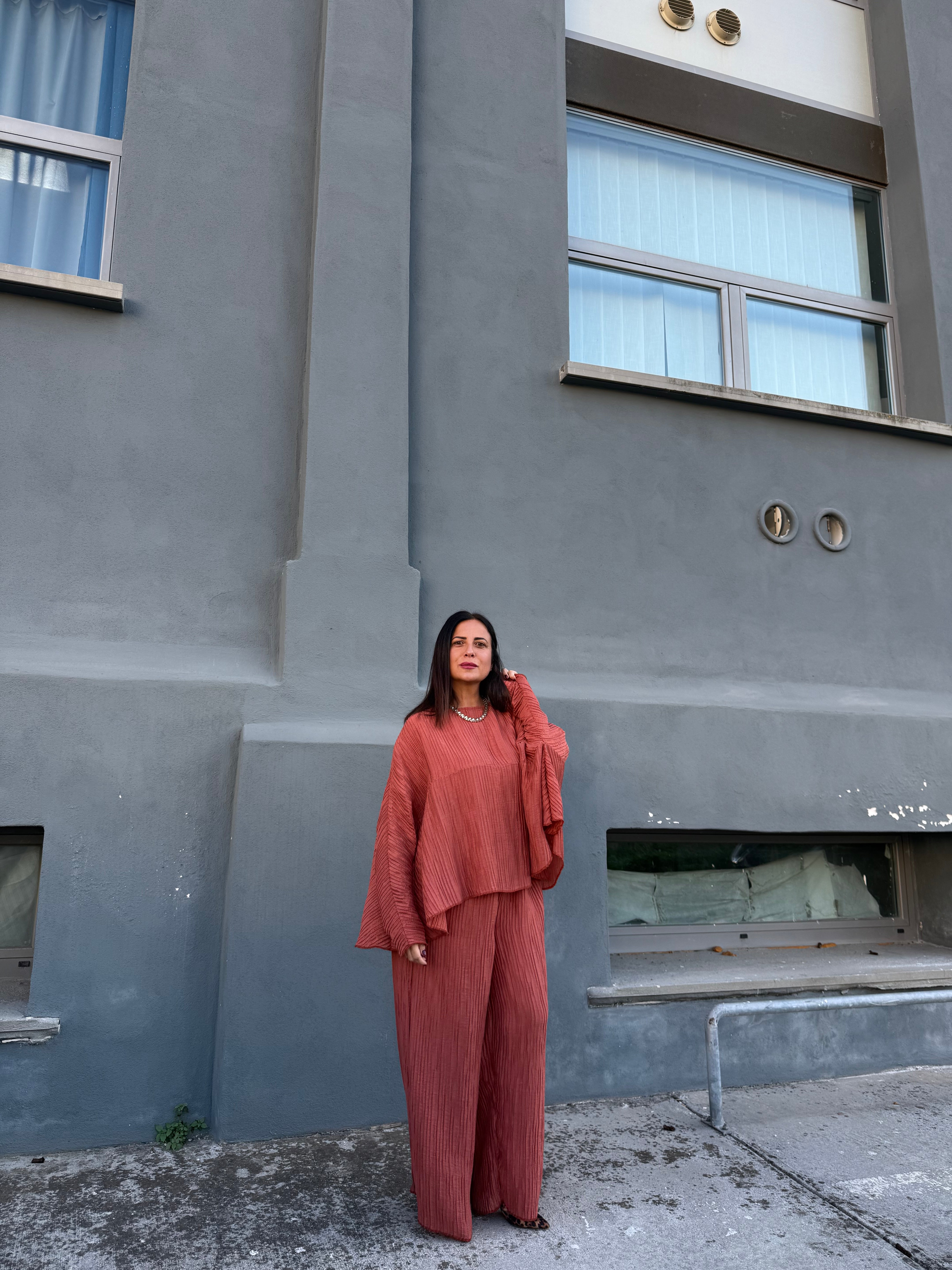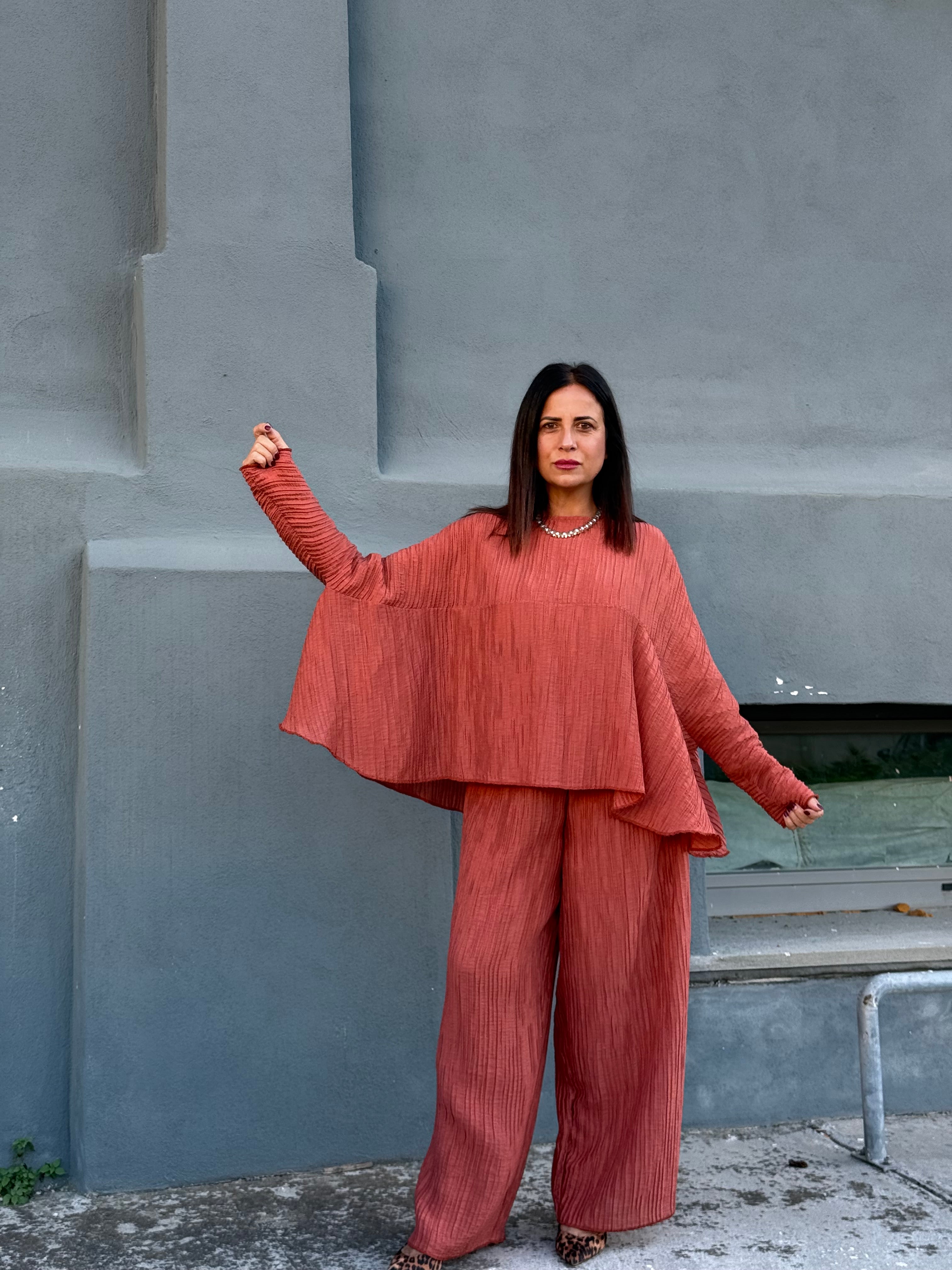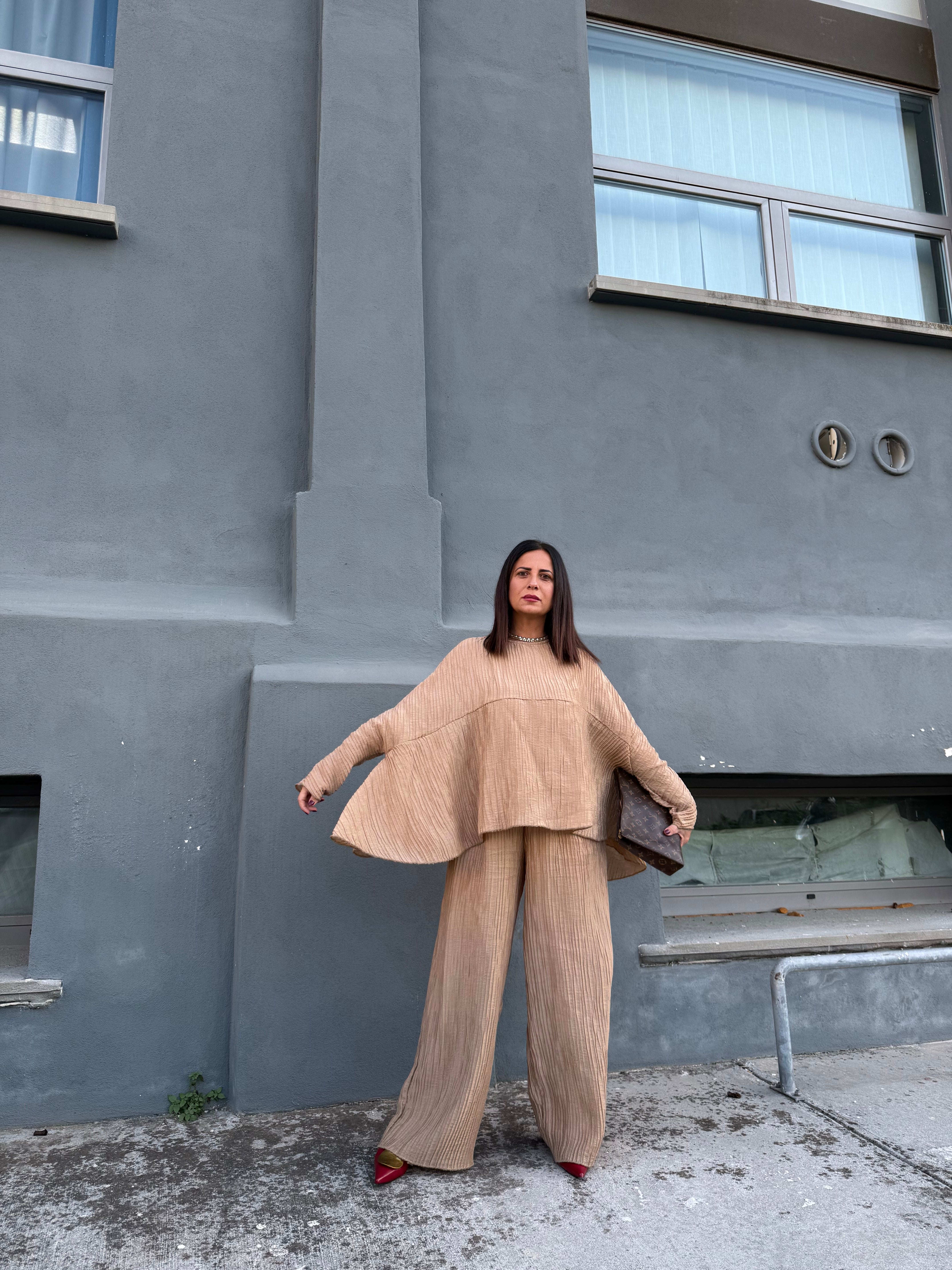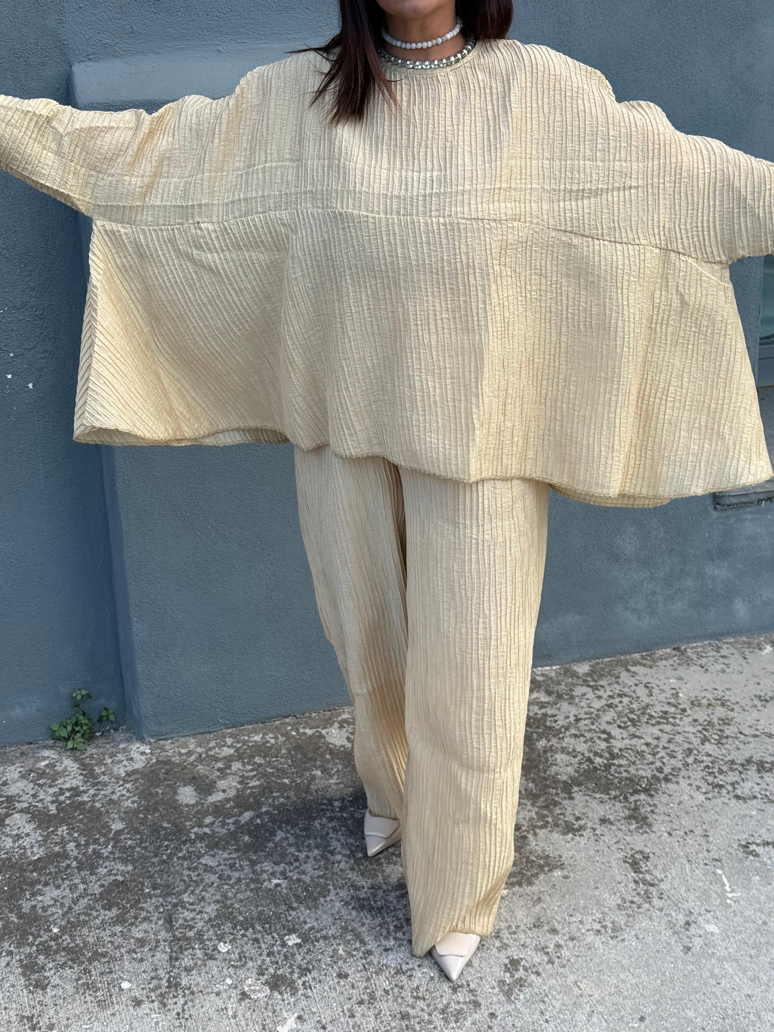 Coordinato in,Lyocell conosciuto anche con il marchio Tencel, è una fibra tessile artificiale ricavata dalla cellulosa di alberi come l'eucalipto, prodotta tramite un processo ecologico a basso impatto ambientale e a ciclo chiuso che permette di riciclare i solventi. Questo tessuto è apprezzato per la sua morbidezza simile alla seta,