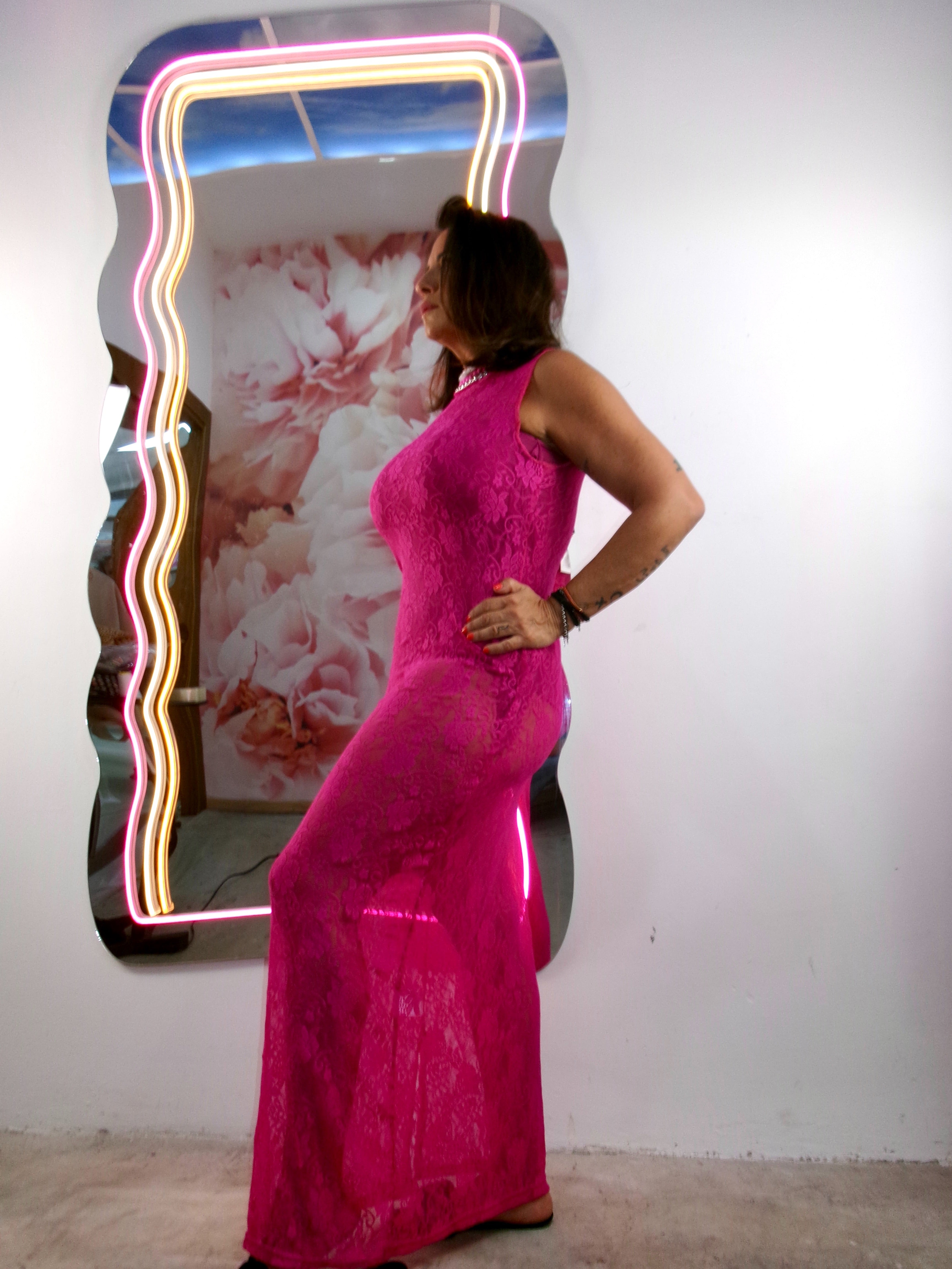 Dress in pizzo stretto in micro rete elasticizzato, giromanica