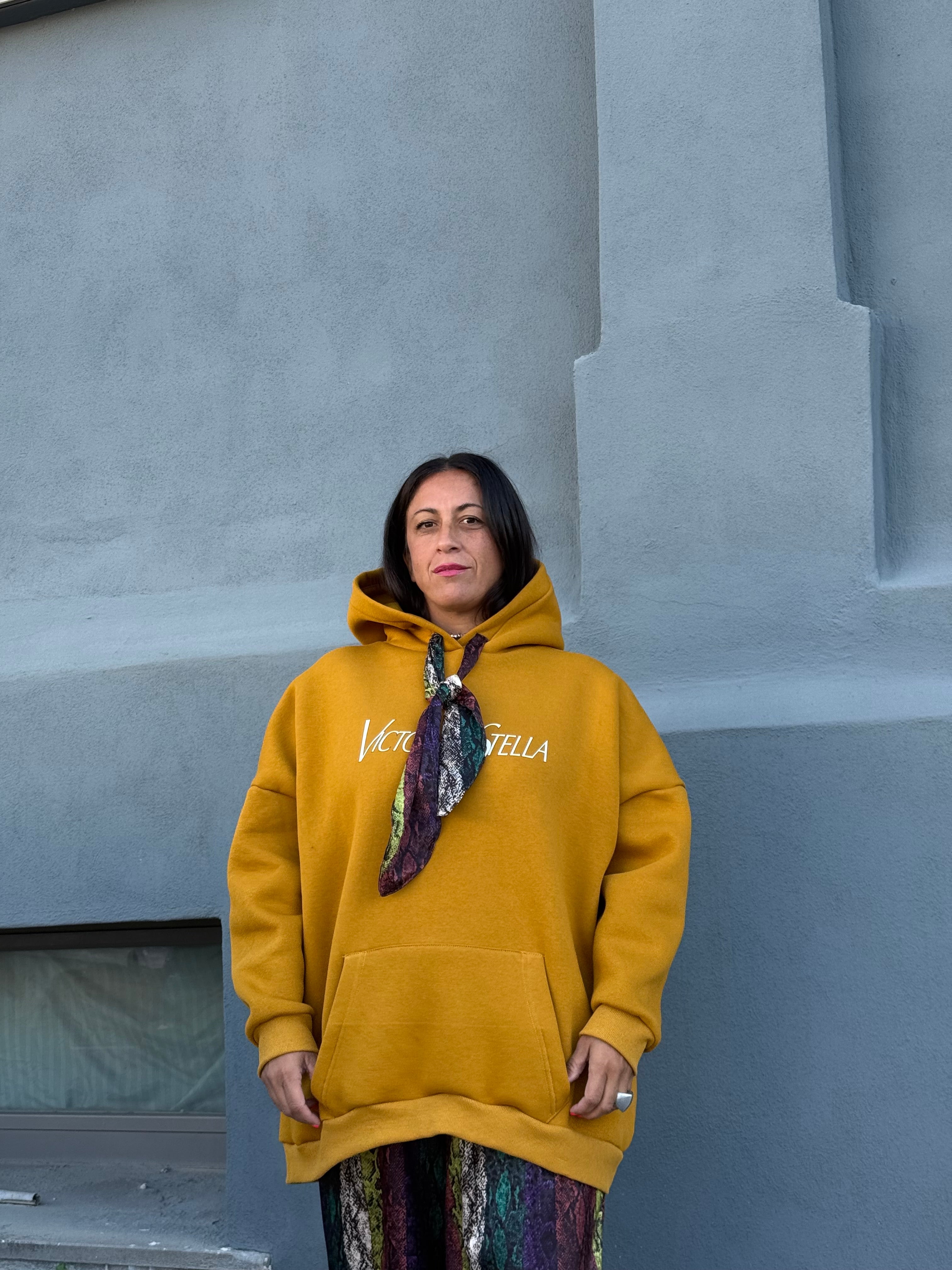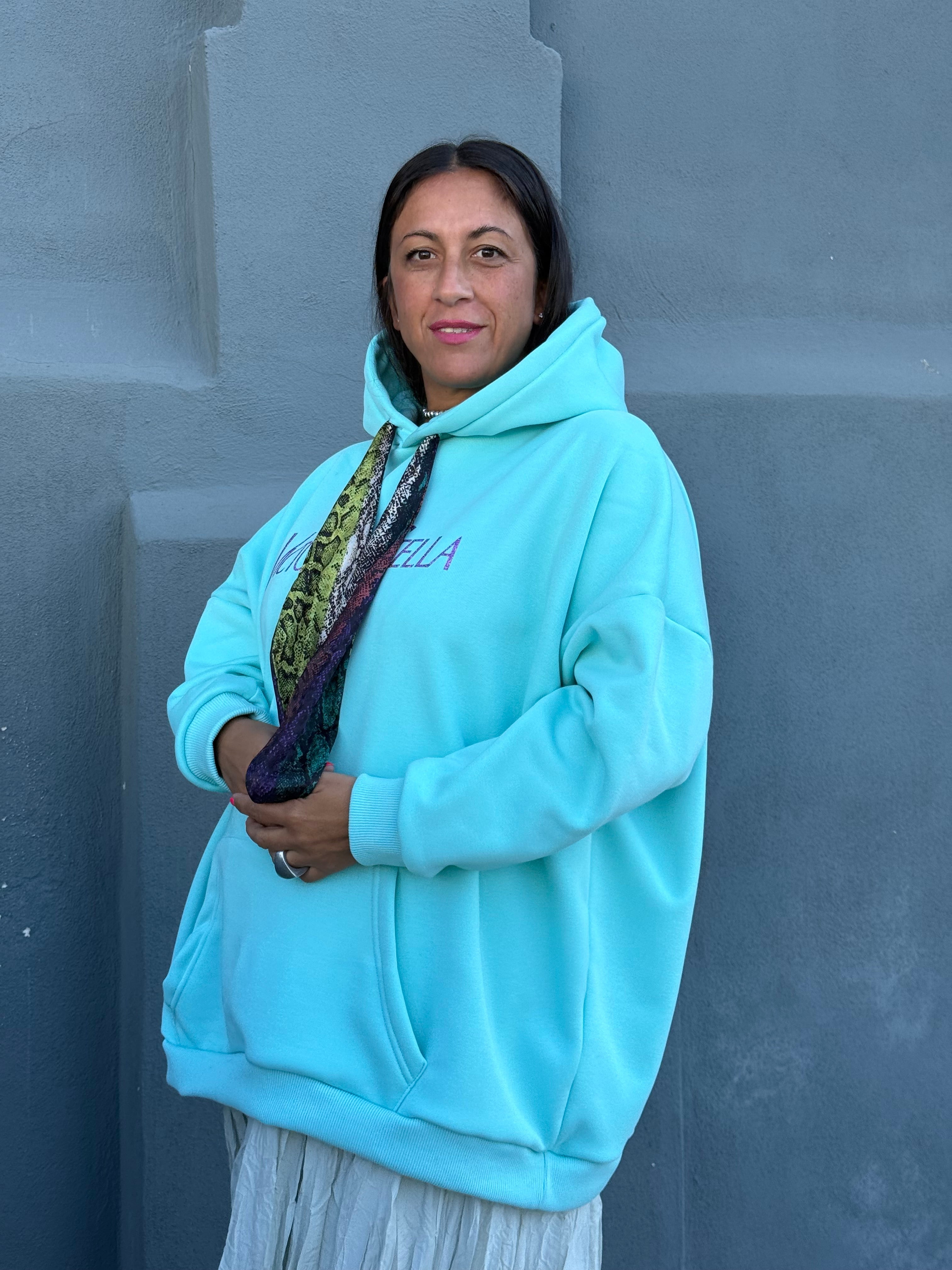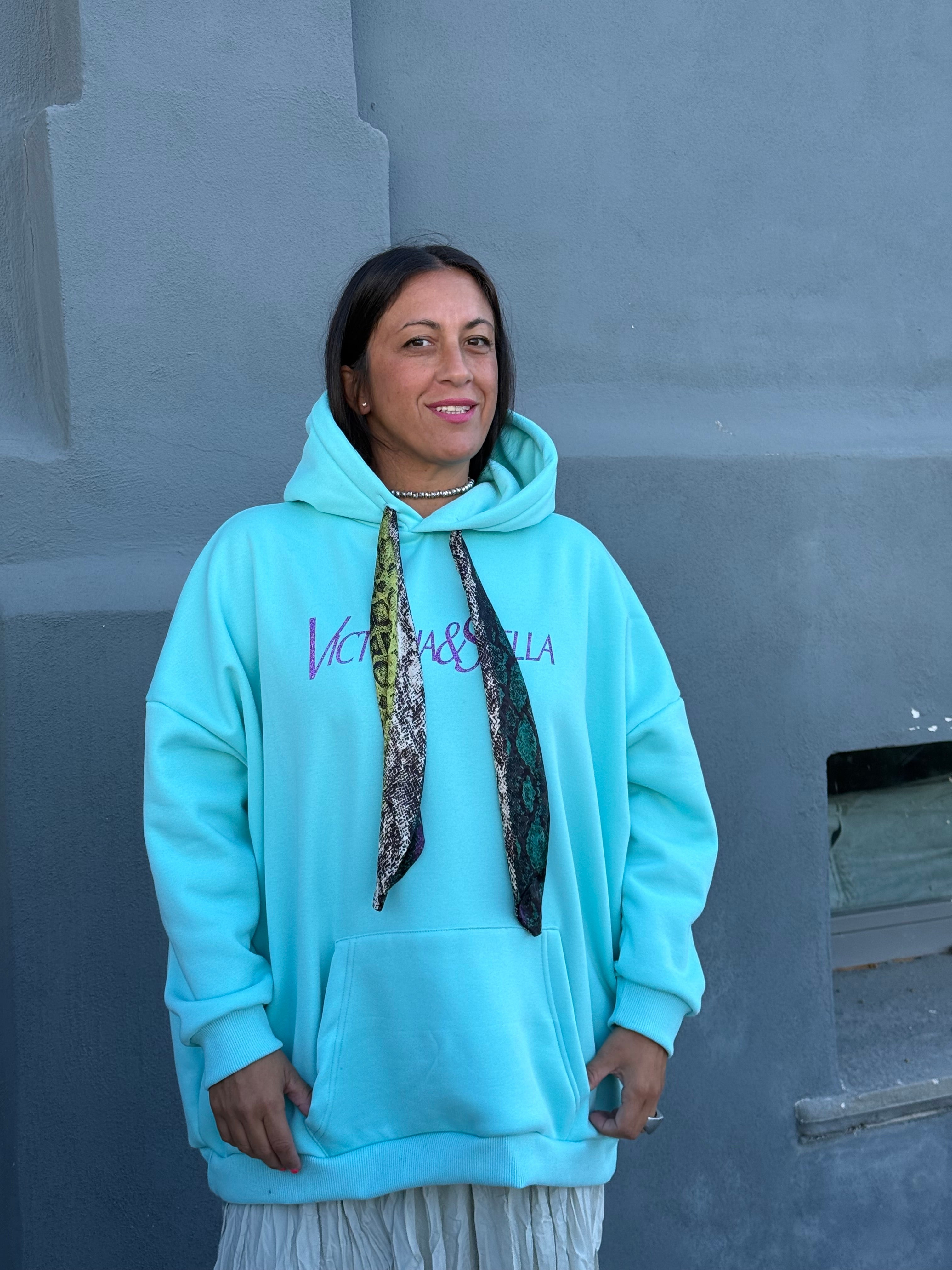Maxy felpa in cotone felpata con cappuccio e laccetti sul davanti stampa anteriore incorporato un foulard in semi seta Pitonato
