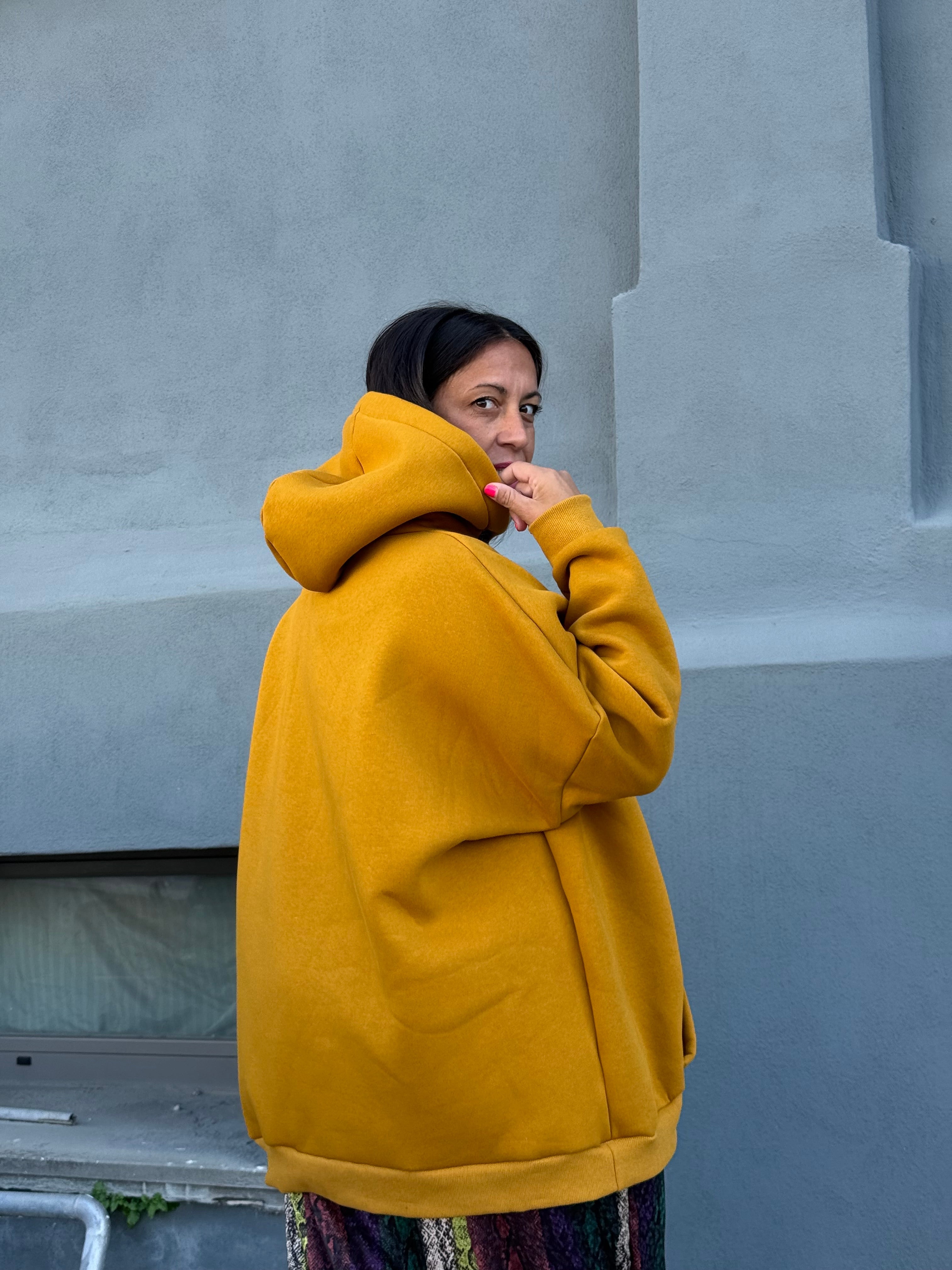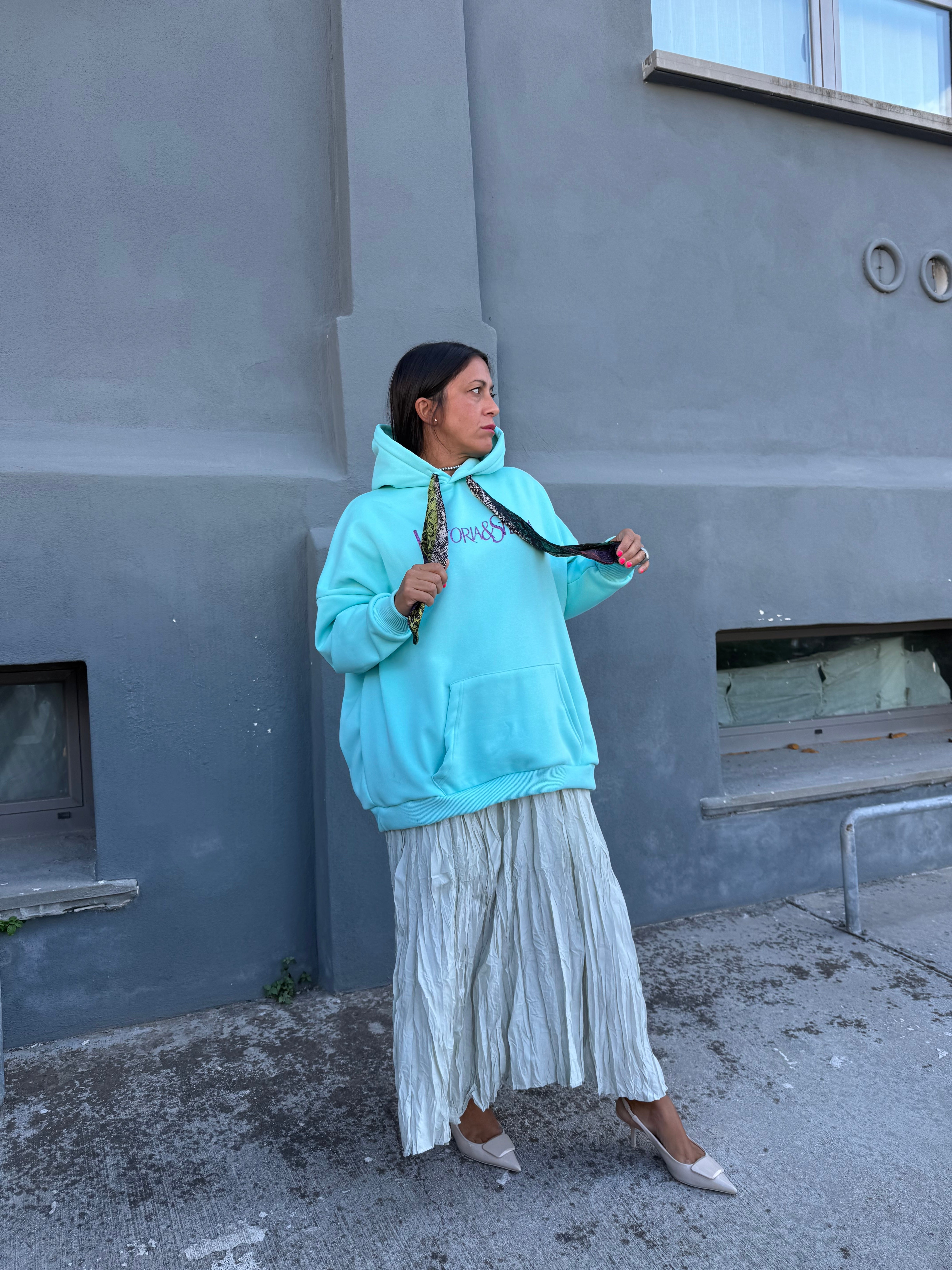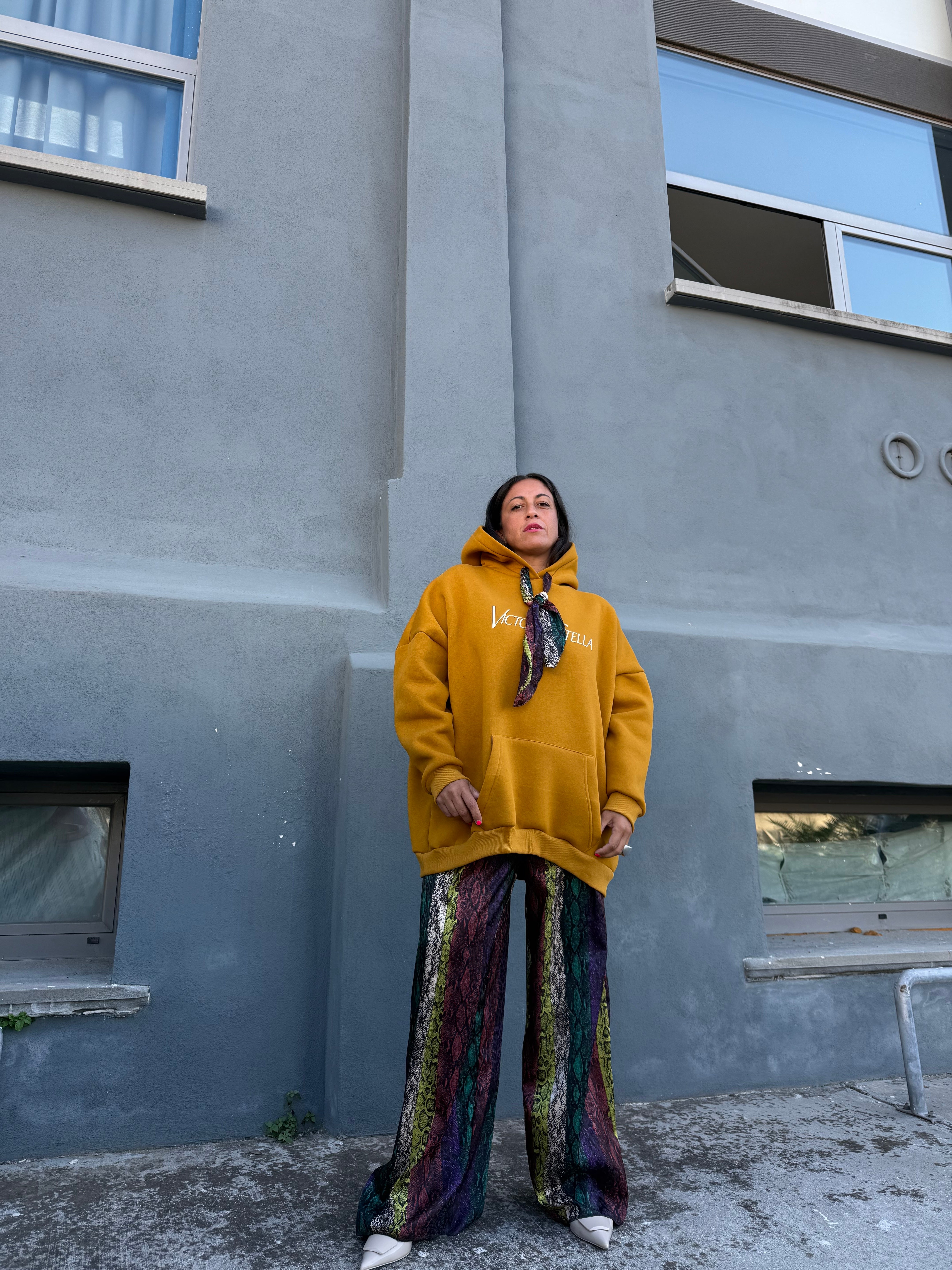 Maxy felpa in cotone felpata con cappuccio e laccetti sul davanti stampa anteriore incorporato un foulard in semi seta Pitonato