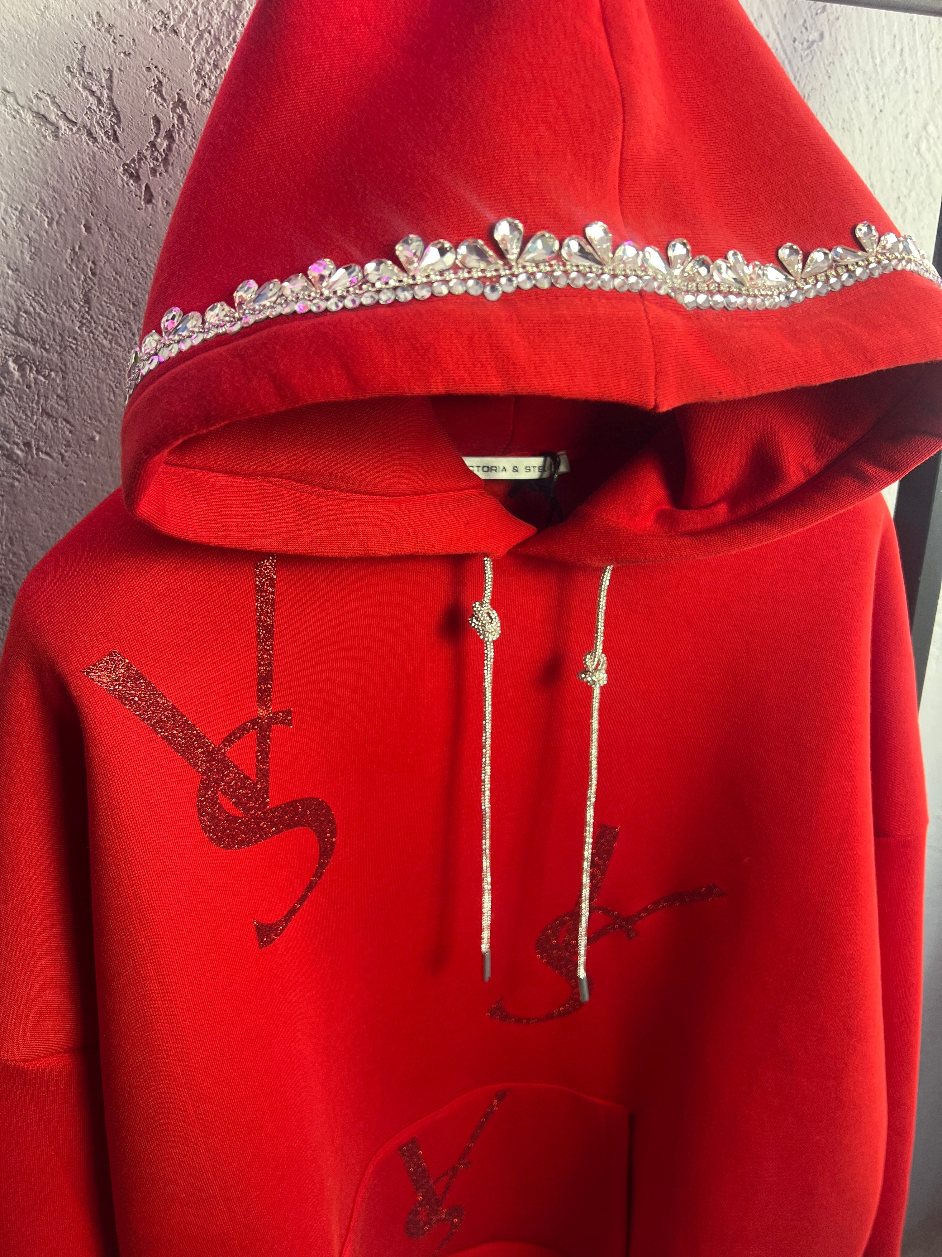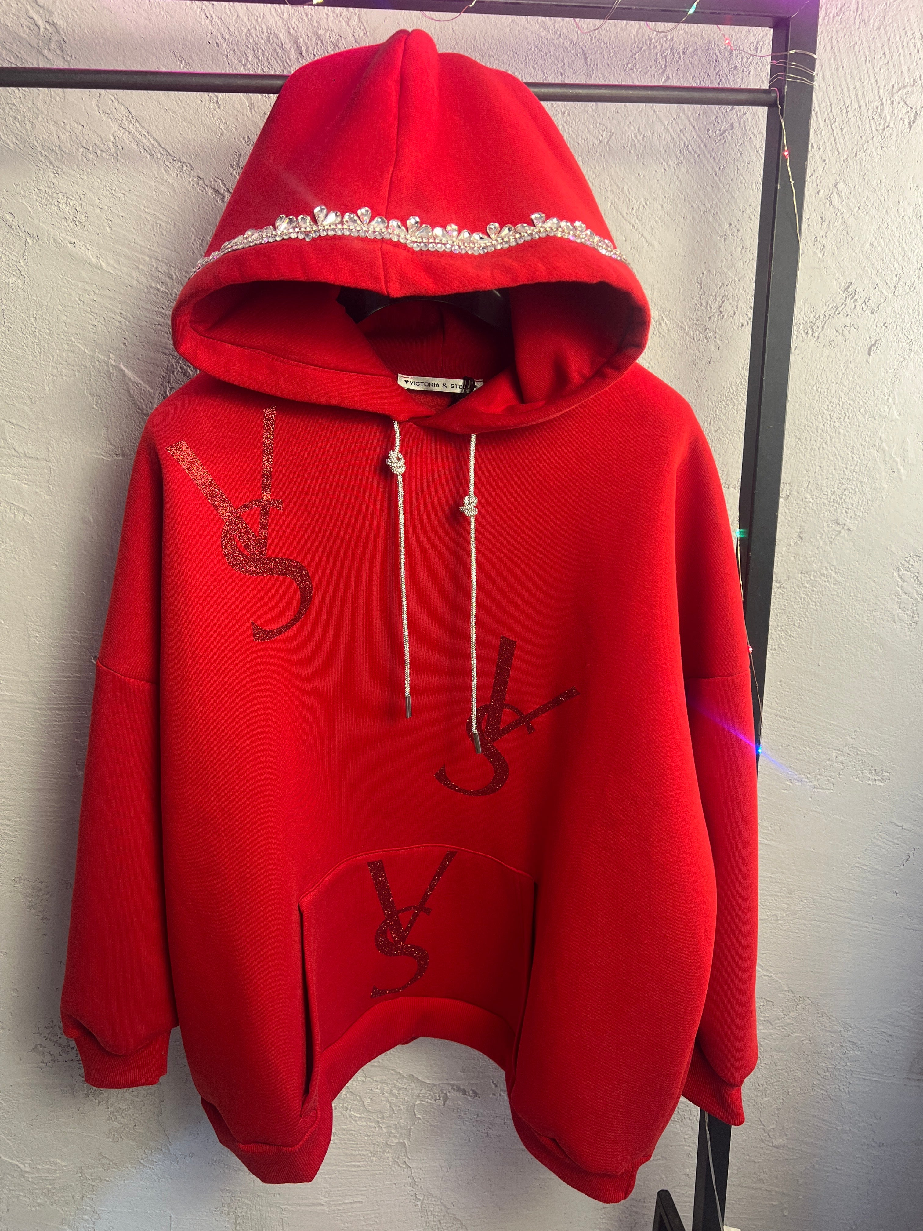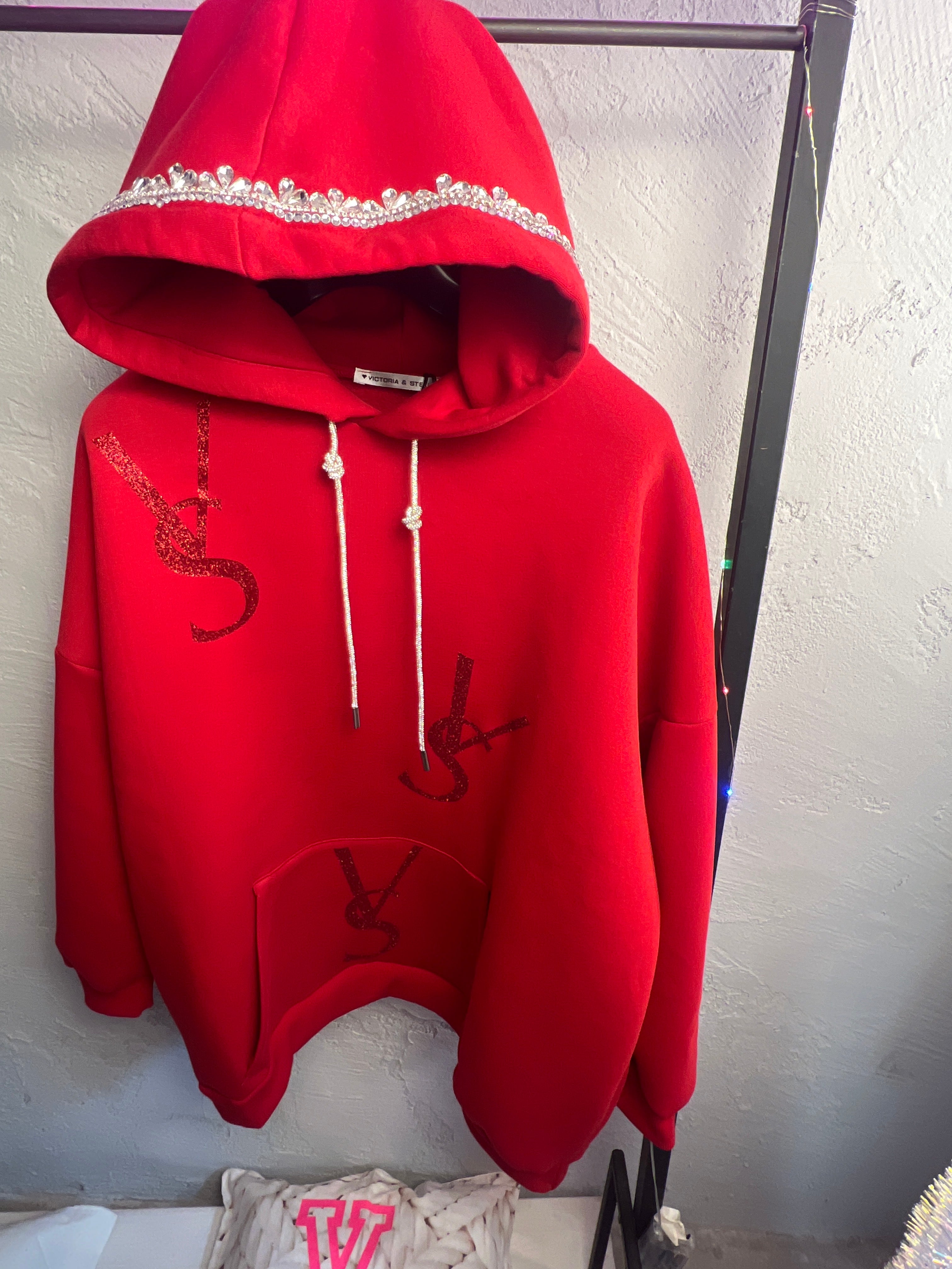 Felpa rossa  calda vestibilità over taglia unica con applicazione gioiello elegante e comoda adatta ad ogni occasione