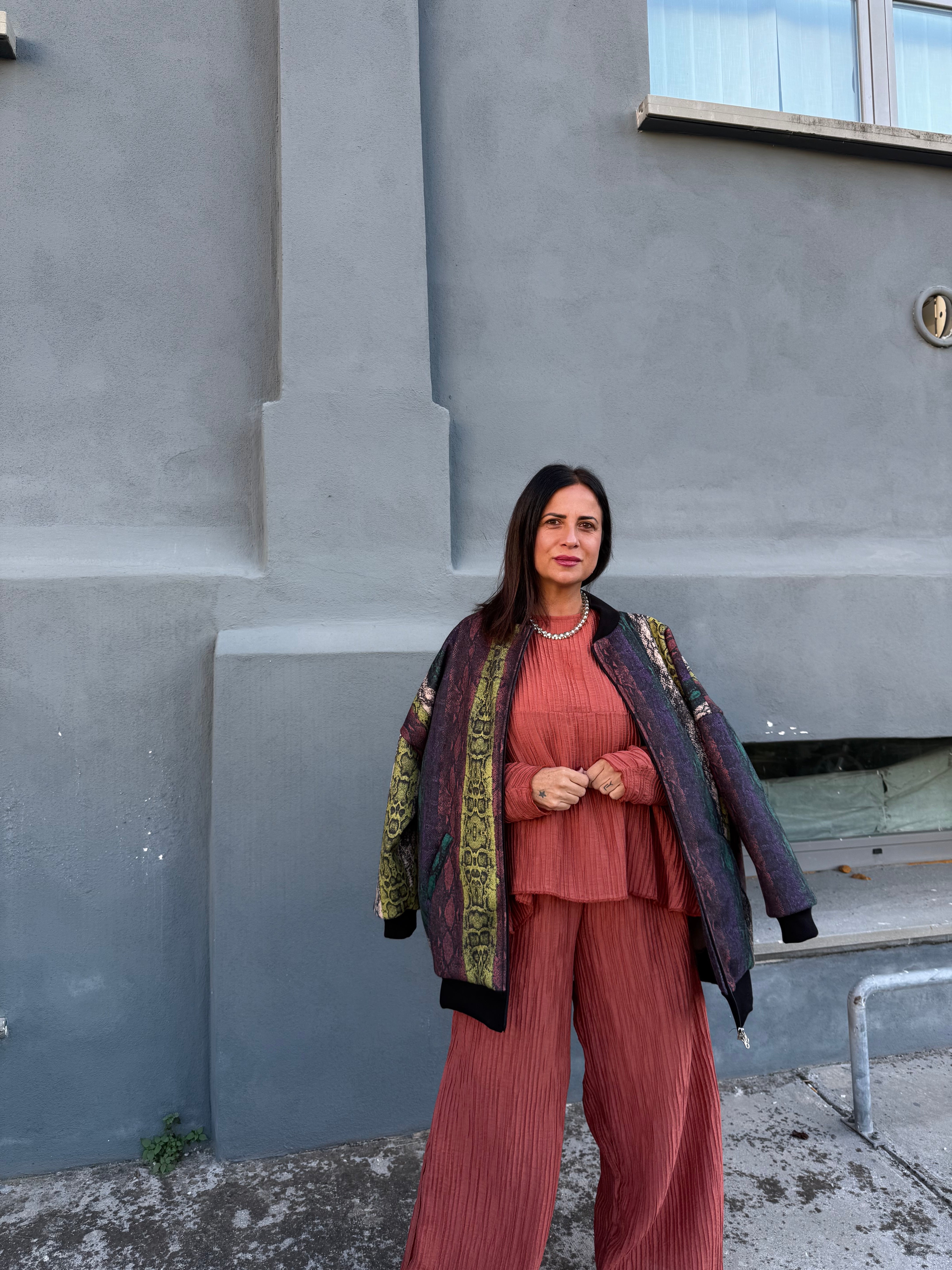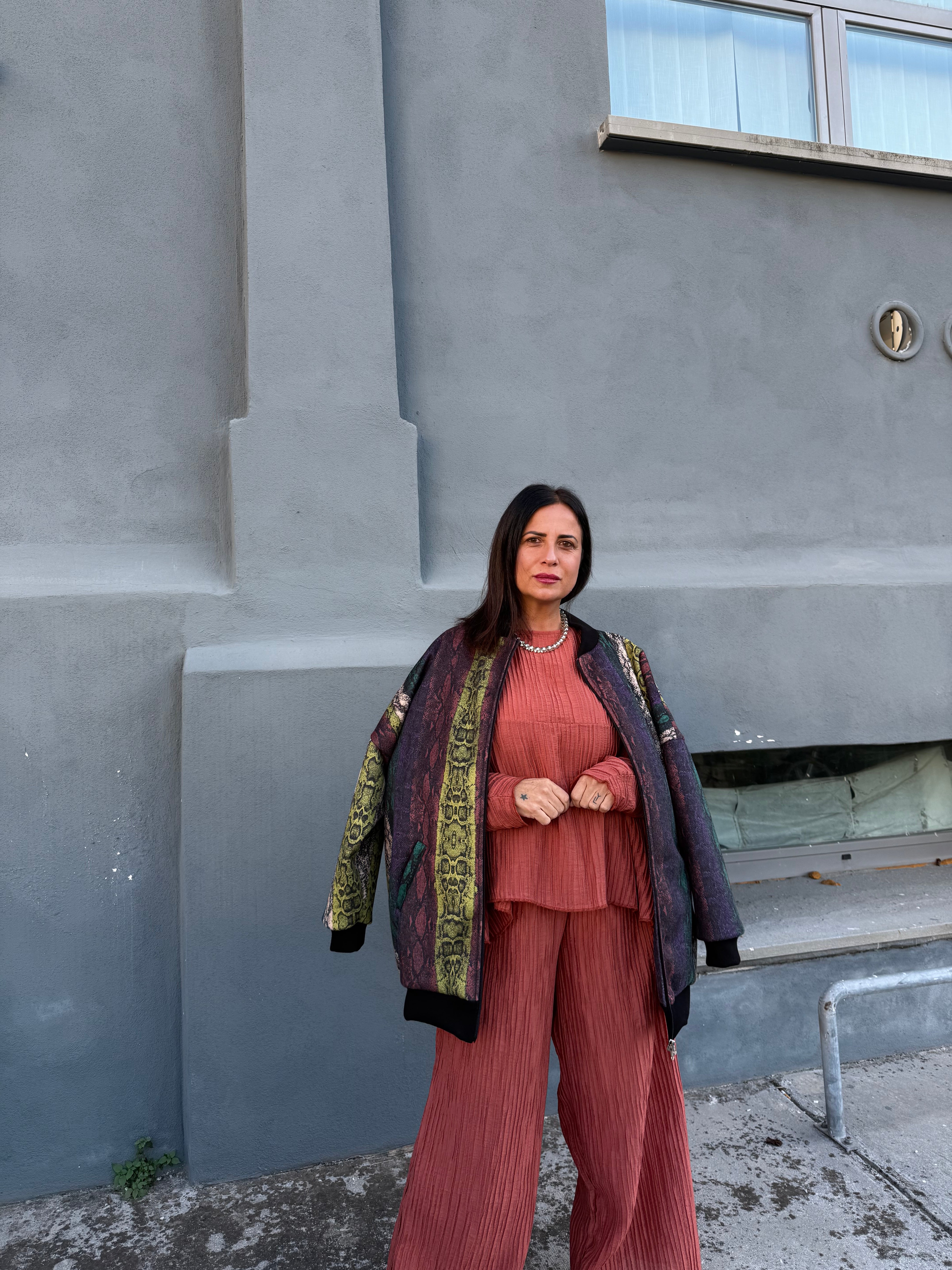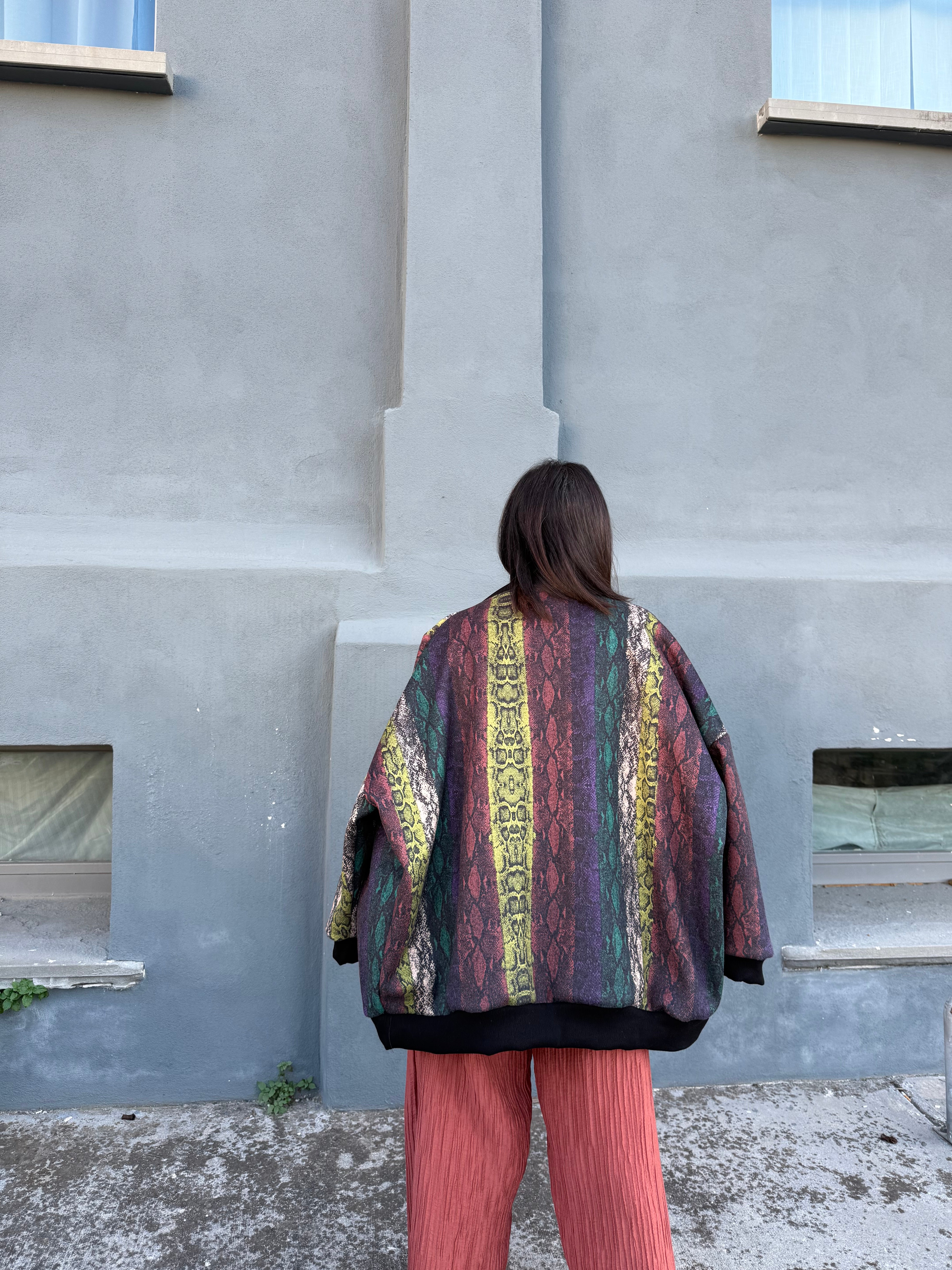 Bomber in panno fantasia pitone, con elastici su polsi e fondo per una vestibilità confortevole e dal taglio contemporaneo. Un capo grintoso e sofisticato che dona carattere a ogni look.